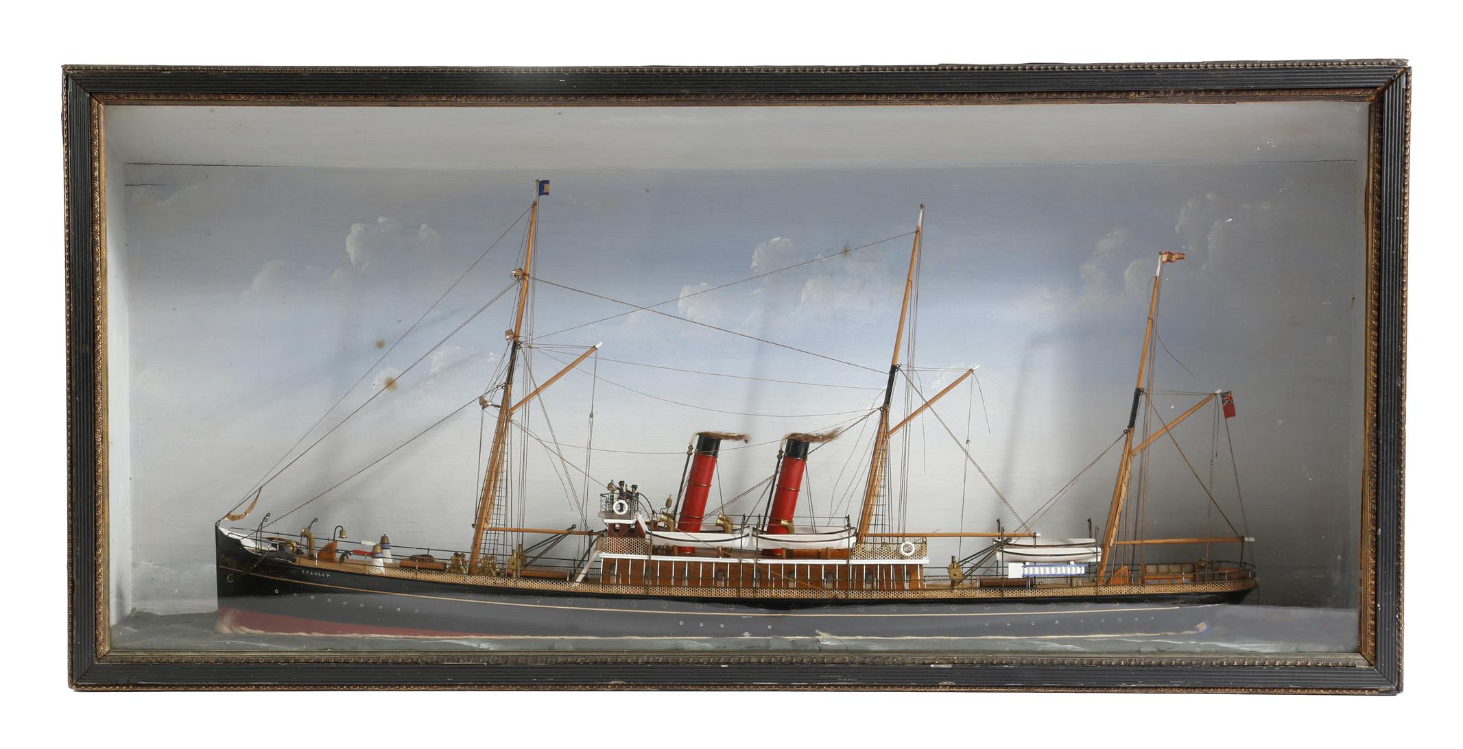 A Victorian painted wood ship diorama, depicting a steam ship 'STANLEY', with a painted cloud background and a naturalistic sea, in a glazed gilt and ebonised case, 41cm high, 86.5cm wide.