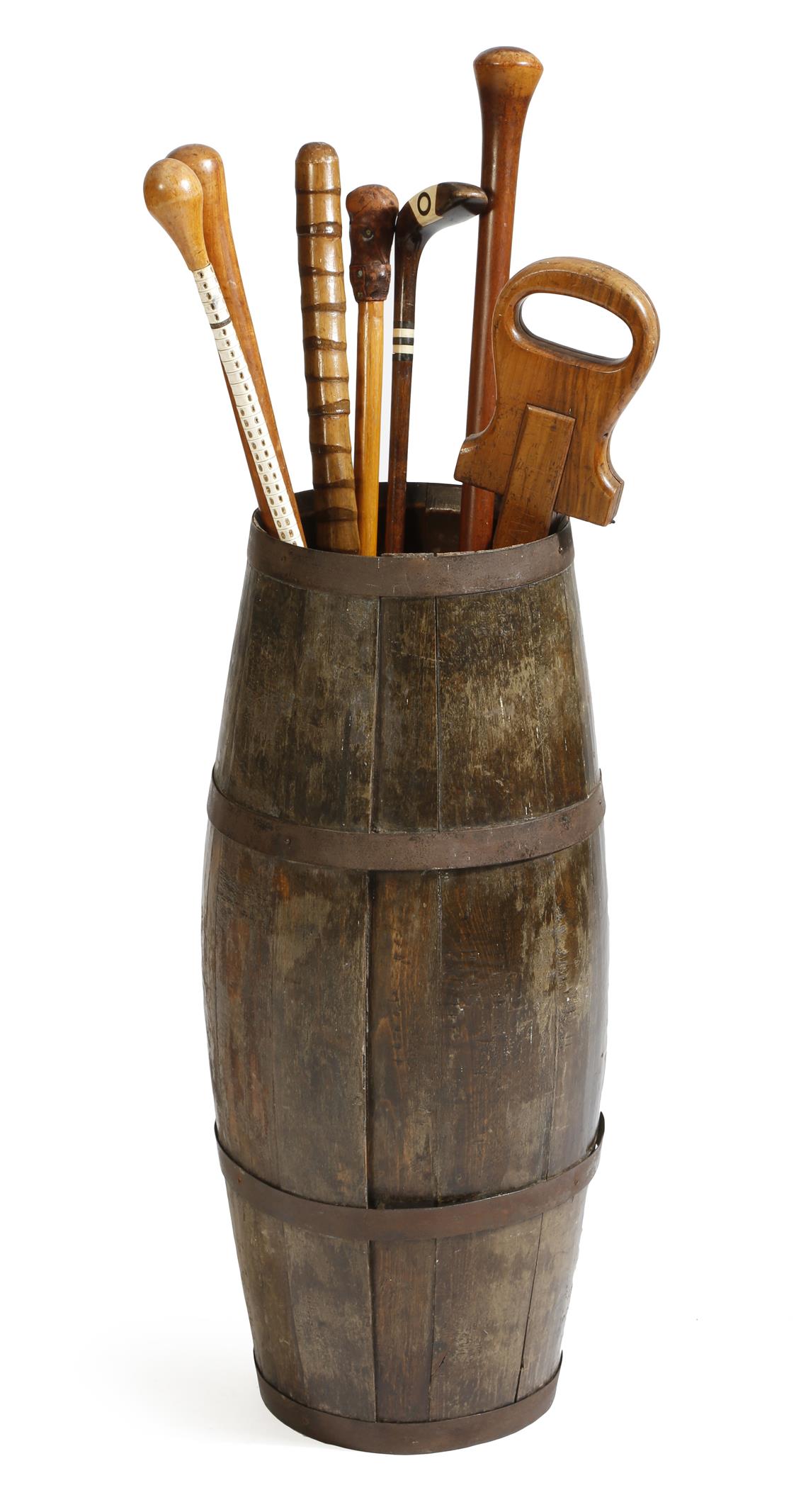 An iron bound barrel stickstand, containing seven various walking sticks, including: a shark's vertebrae cane, a Sunday club and a shooting stick, 96.4cm long (max). (8)