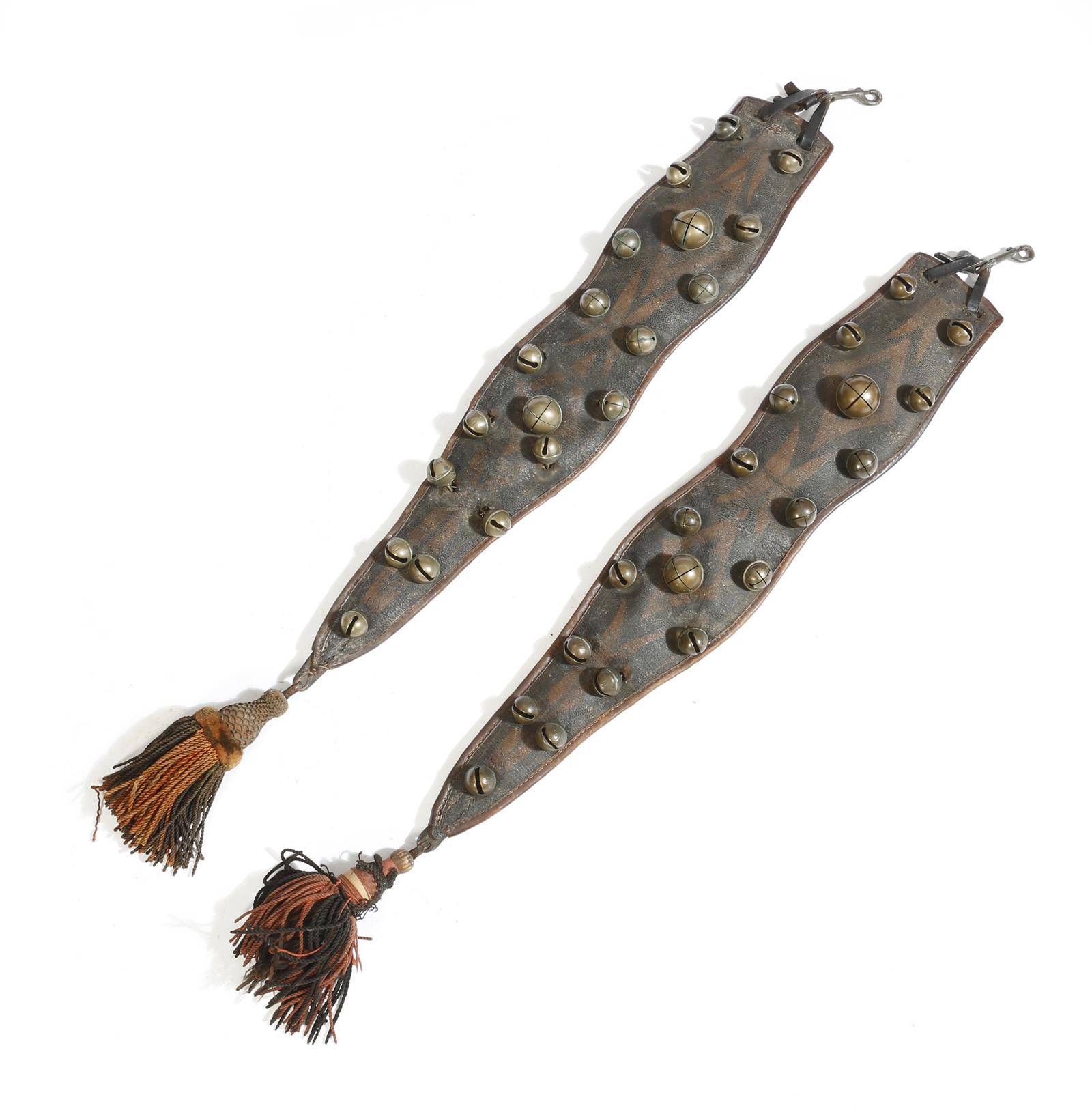 A pair of Indian leather and brass elephant bell tassels