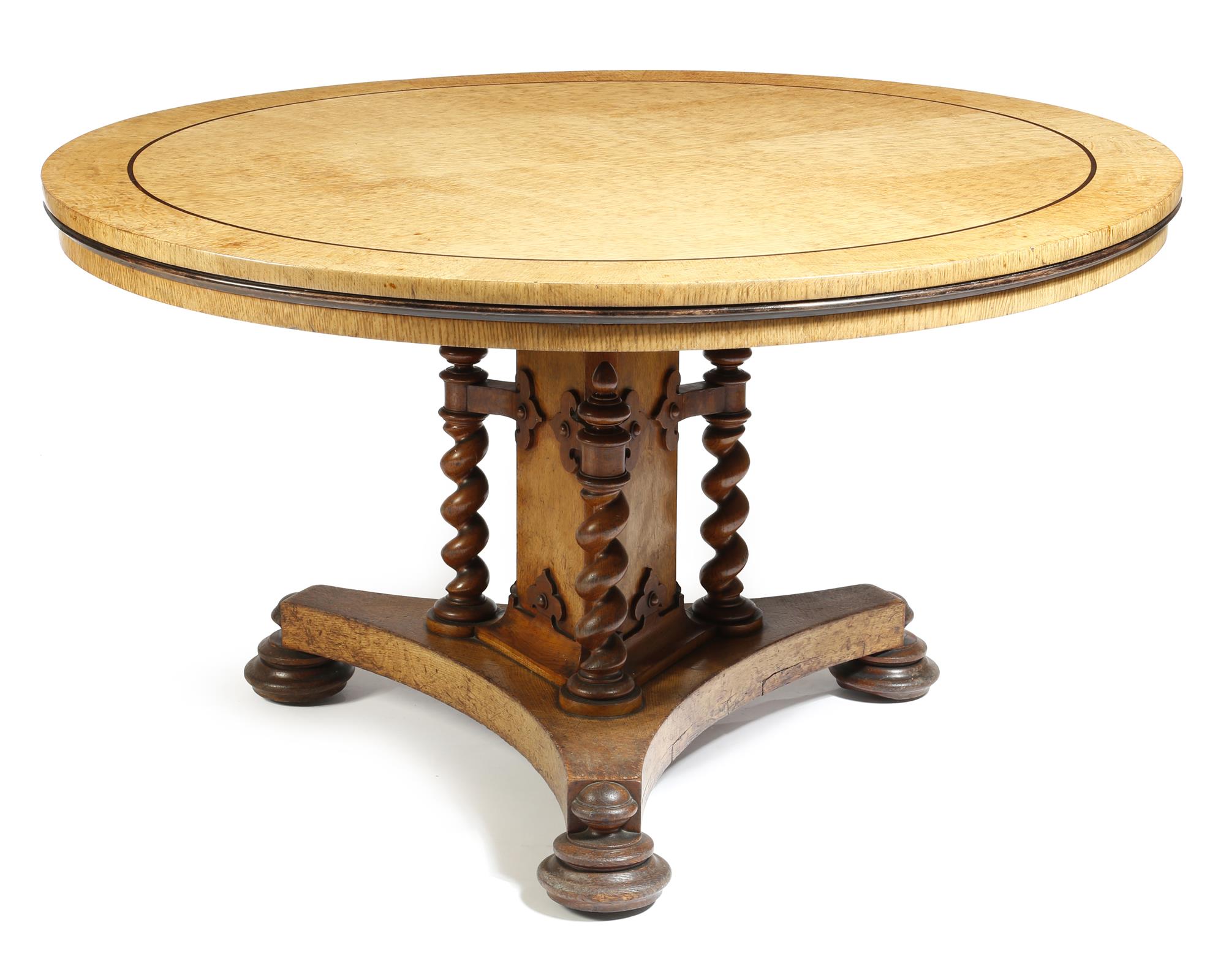 A Victorian oak breakfast table, the faded circular crossbanded tilt-top inlaid with ebonised stringing, on a triform stem with applied strapwork decoration and three spiral twist columns, on a platform based disc feet and sunken brass castors, 73.9cm high, 127cm diameter.
