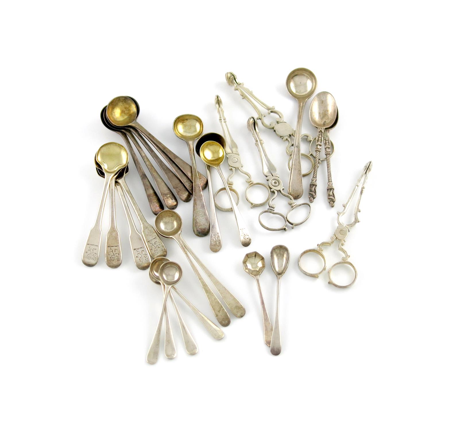 comprising: four pairs of 18th century sugar nips, a set of four Fiddle pattern salt spoons, by Eley, Fearn and Chawner, a set of five salt spoons, plus a condiment ladle, two teaspoons, eight condiment spoons and an electroplated condiment spoon, approx. weighable 11.8oz. (qty)