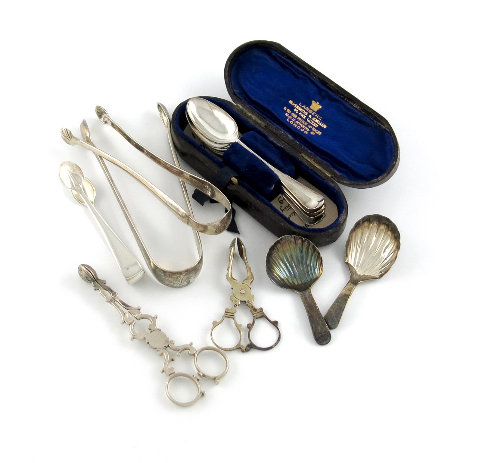 comprising: a matched set of six George II Hanoverian pattern teaspoons, five by Marmaduke Daintry, circa 1740, the other by another maker, in a fitted case, plus two caddy spoons, two pairs of sugar nips and three pairs of sugar tongs, approx. weight 7.6oz. (qty)