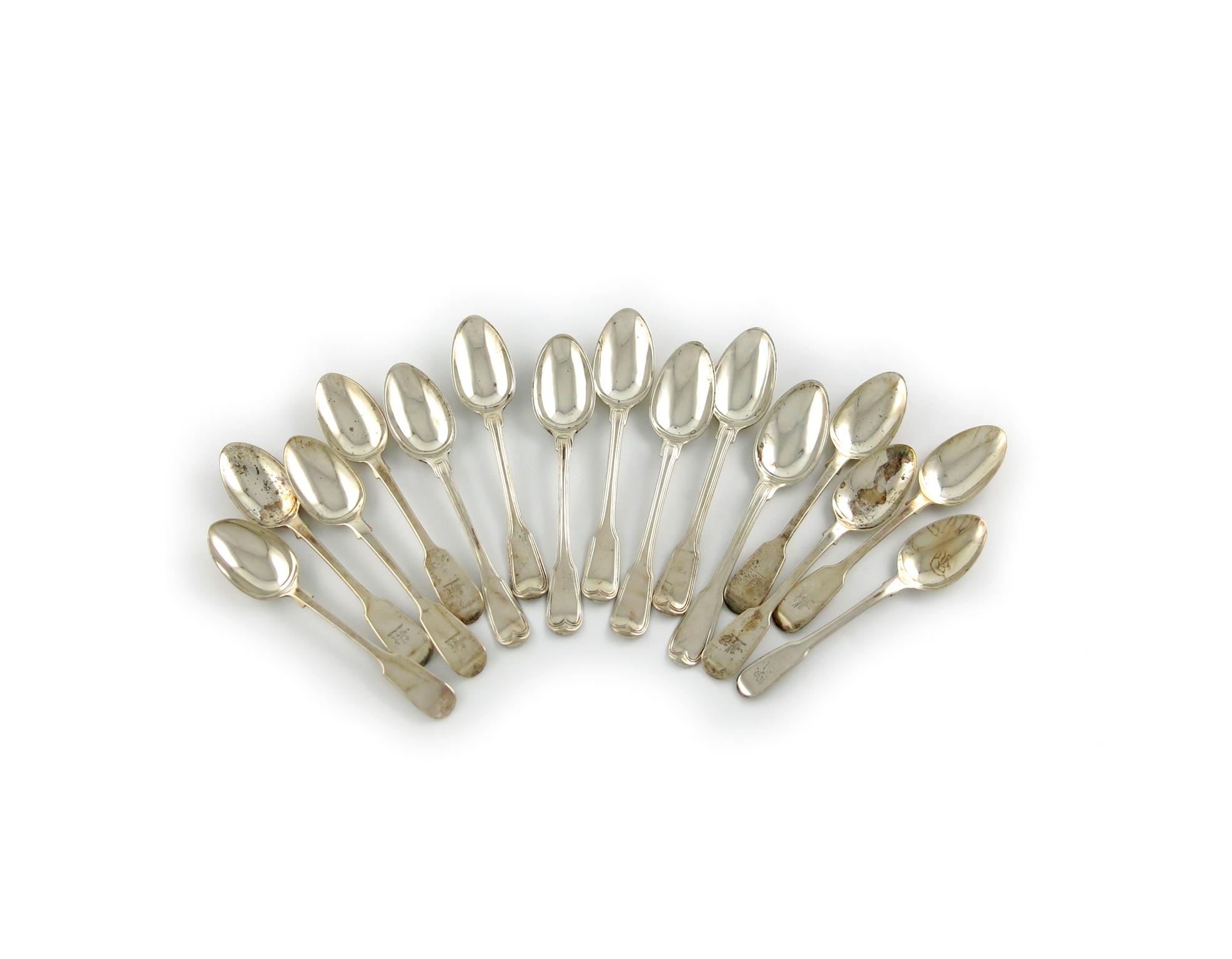 comprising: a set of six Victorian Fiddle pattern spoons, by George Adams, London 1828, the terminals with the Finch crest, plus seven English and Continental Fiddle and Thread pattern teaspoons and two Fiddle pattern teaspoons, approx. weight 12.5oz. (15)