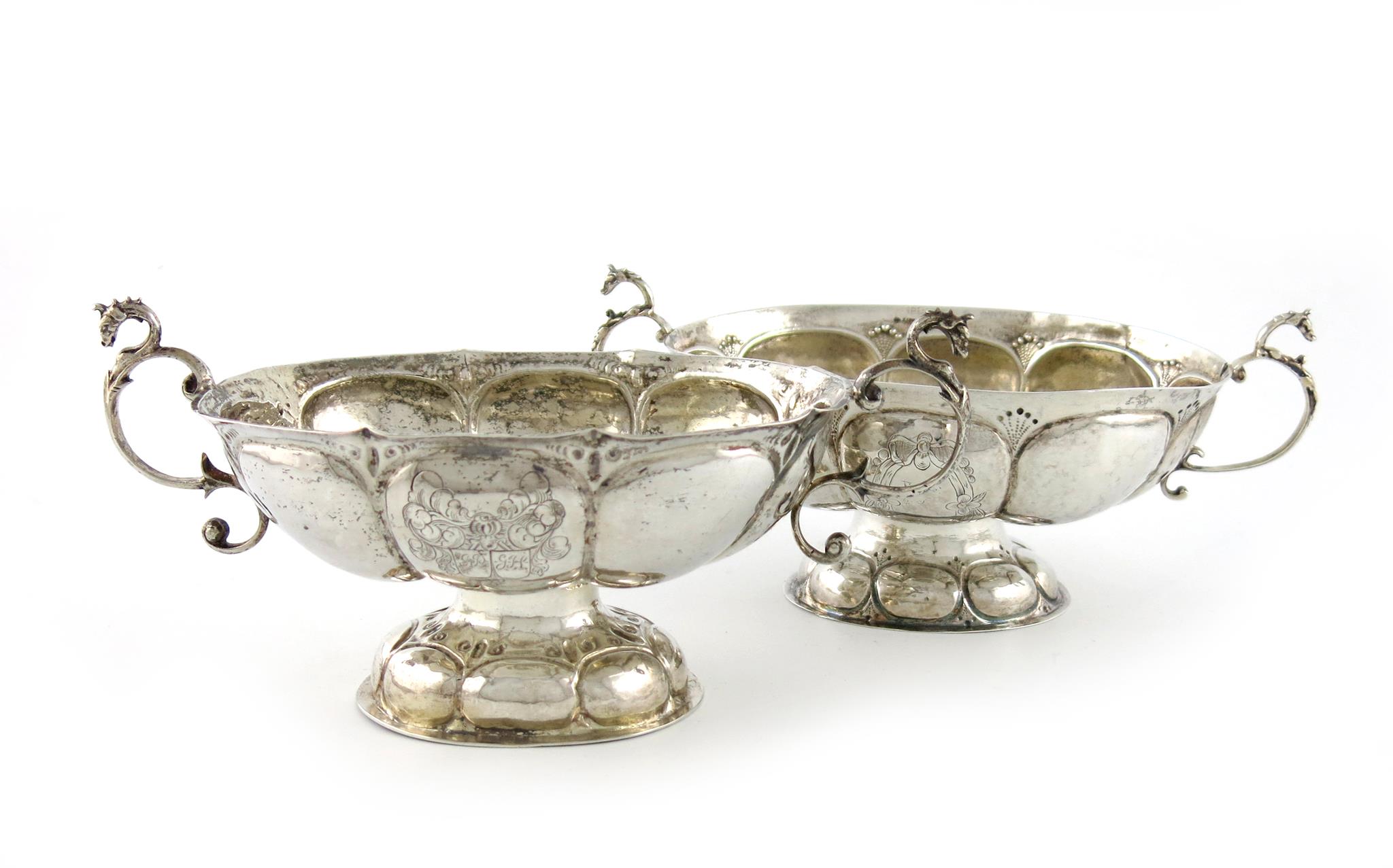 lobed oblong form, scroll handles with mythical beast mounts, engraved with an initialled armorial shield within foliate scroll mantling, on a raised lobed circular foot, length handle to handle 23cm, plus a late-18th century Dutch silver two-handled brandy bowl, maker's mark of JS, scroll handles with mythical beast mounts, engraved with ribbon-tied initials on a raised lobed circular foot, length handle to handle 22.5cm, approx. weight 13.5oz. (2)