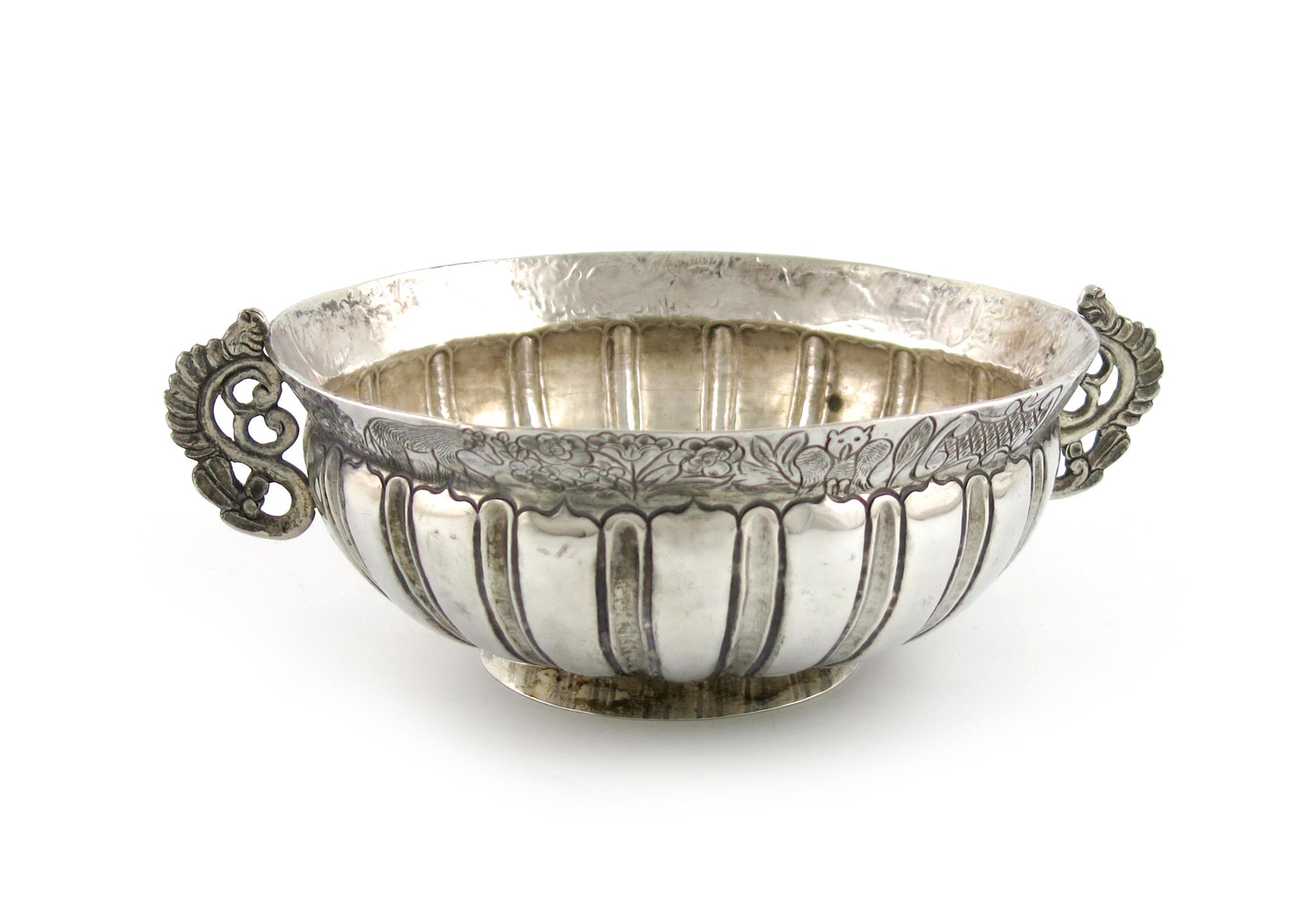 circular form, pierced side scroll handles with stylised caterpillars, fluted decoration below a border of fish and animals within foliate scroll decoration, on a circular foot, diameter 18.7cm, approx. weight 18.8oz.