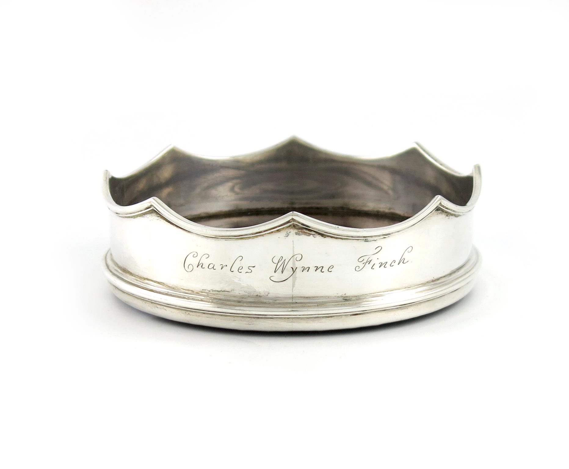 circular form, wavy-edge border, turned wooden base, inscribed, diameter 12.3cm.