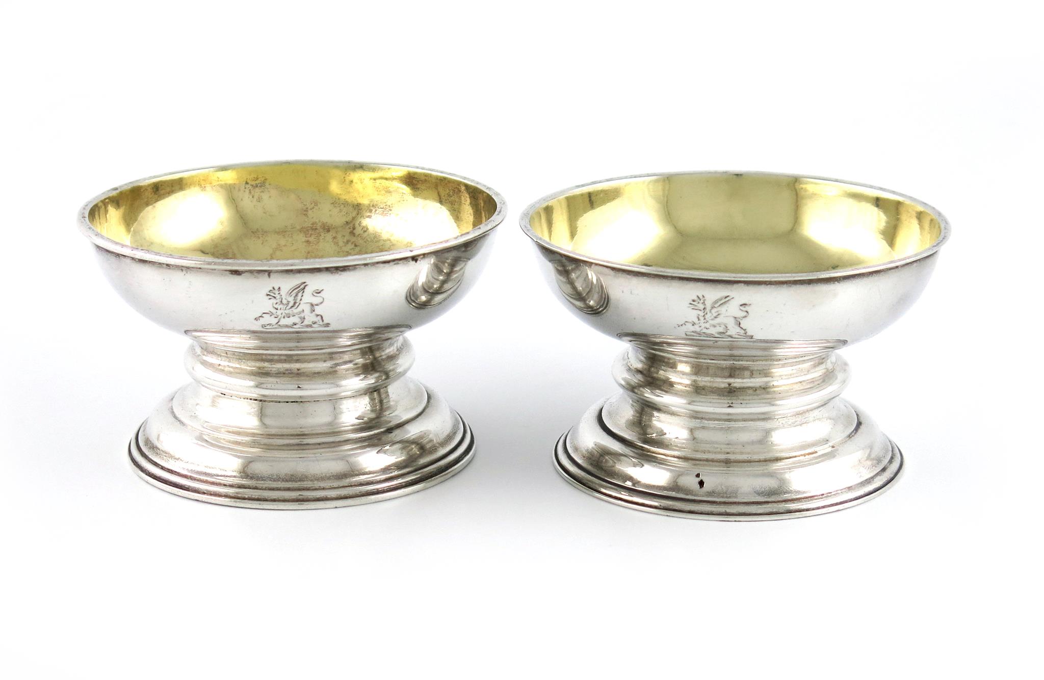 circular form, gilded bowls, on raised circular bases, engraved with the Finch crest, diameter 9cm, heights 5.4cm and 5.3cm, approx. weight 10oz. (2)