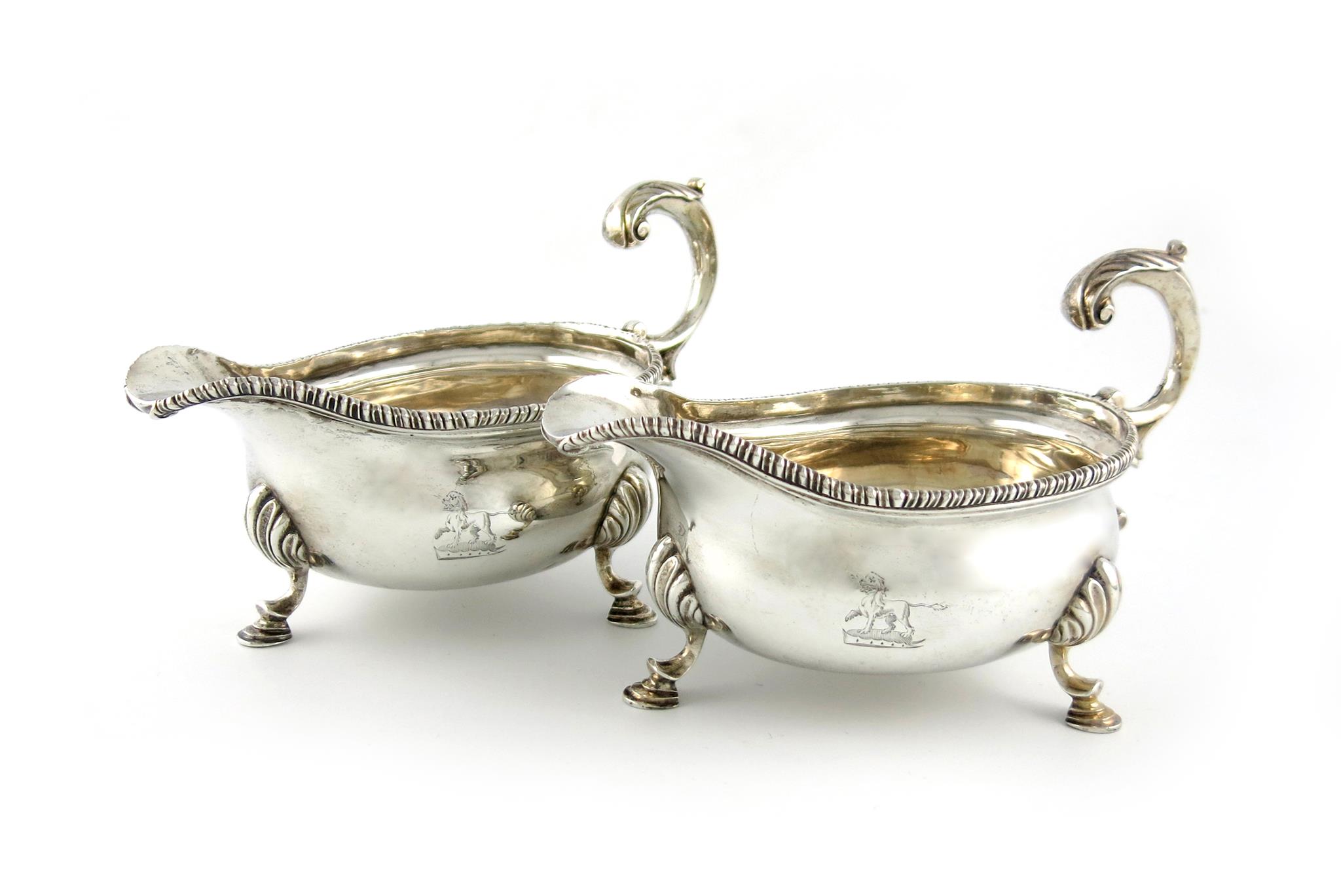 oval form, leaf-capped flying scroll handles, gadroon borders, on three shell-capped hoof feet, engraved with the Griffith crest, length 21.5cm, approx. weight 31oz. (2)