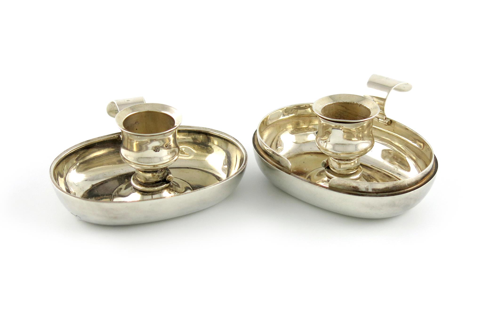 oval form, hinged scroll handles, hinged capitals, on oval bases that fit together, length 9.3cm, approx. weight 6.2oz. (2)