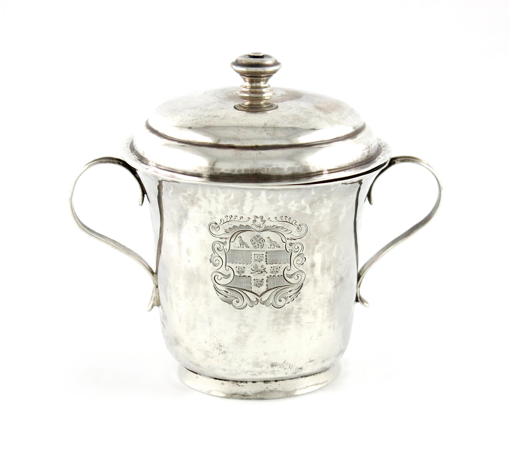 tapering circular form, fluted scroll handles, the bowl later gilded, engraved with an armorial, together with a later unmarked associated cover, height 12cm, approx. weight 6.4oz. (2)