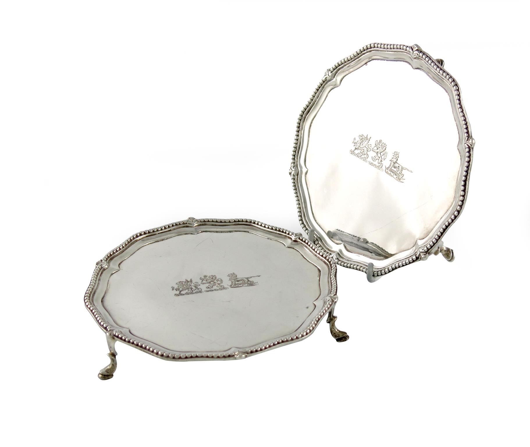 circular form, beaded borders, on three hoof feet, engraved with the Wynne, Finch, and Griffith crests, diameter 15.2cm, approx. weight 11.8oz. (2)