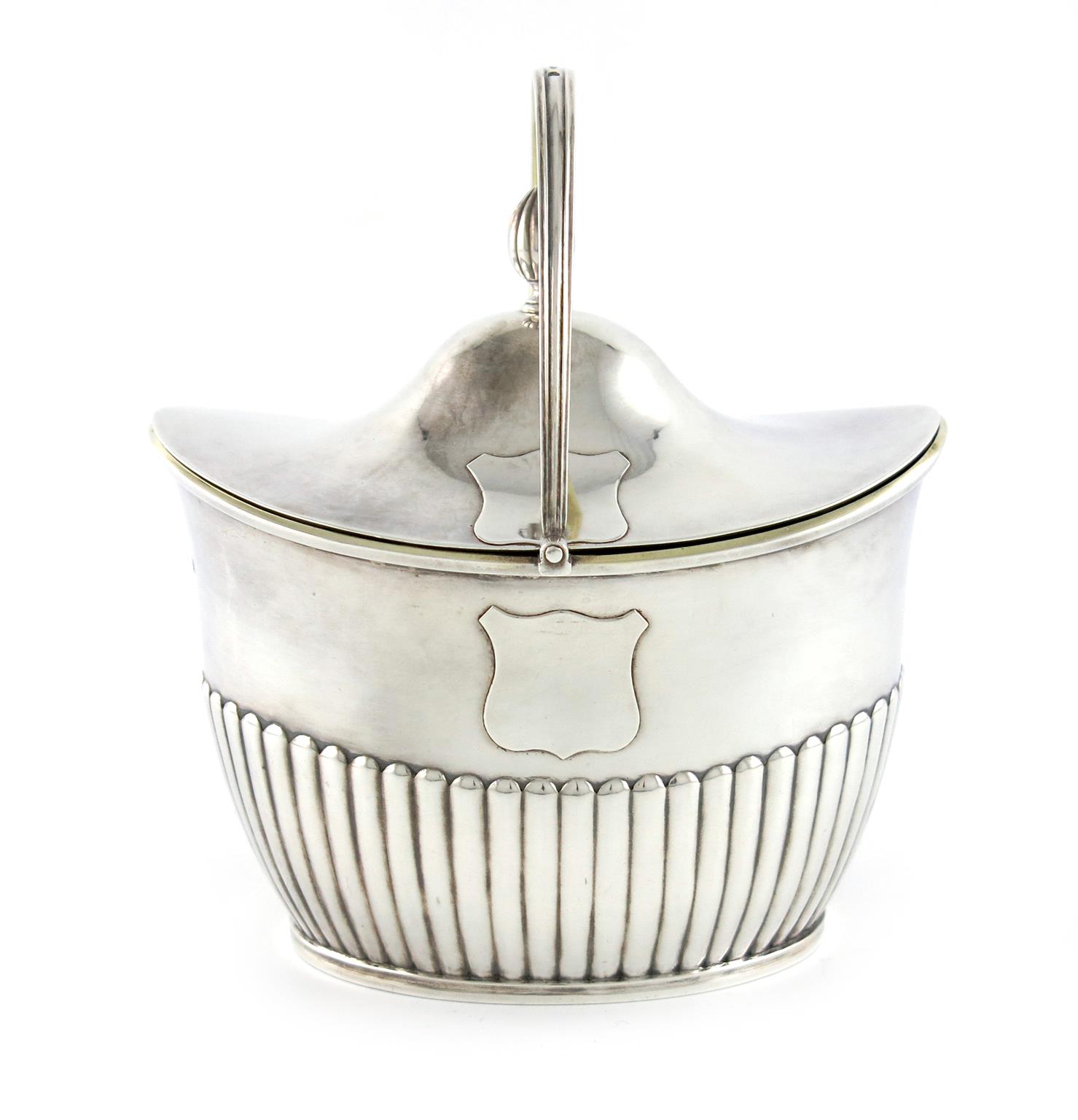 oval form, fluted decoration, reeded swing-handle, the pull-off cover with a fluted finial, gilded interior, the cover and side applied with a vacant shield cartouche, length 13.8cm, approx. weight 12oz.