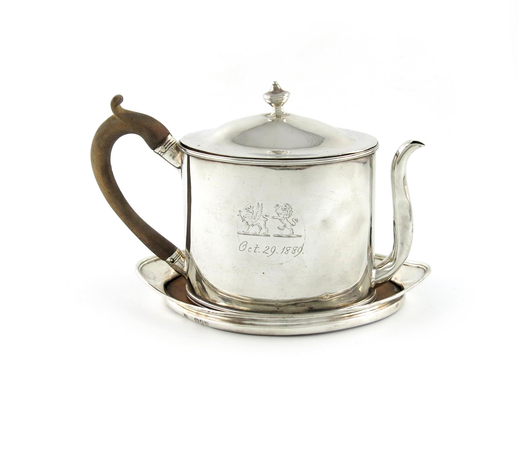 oval form, wooden scroll handle, pull-off cover with an urn finial, reeded borders, engraved with the Wynne Finch crests and dated Oct 29 1889, the reverse inscribed 'Ah