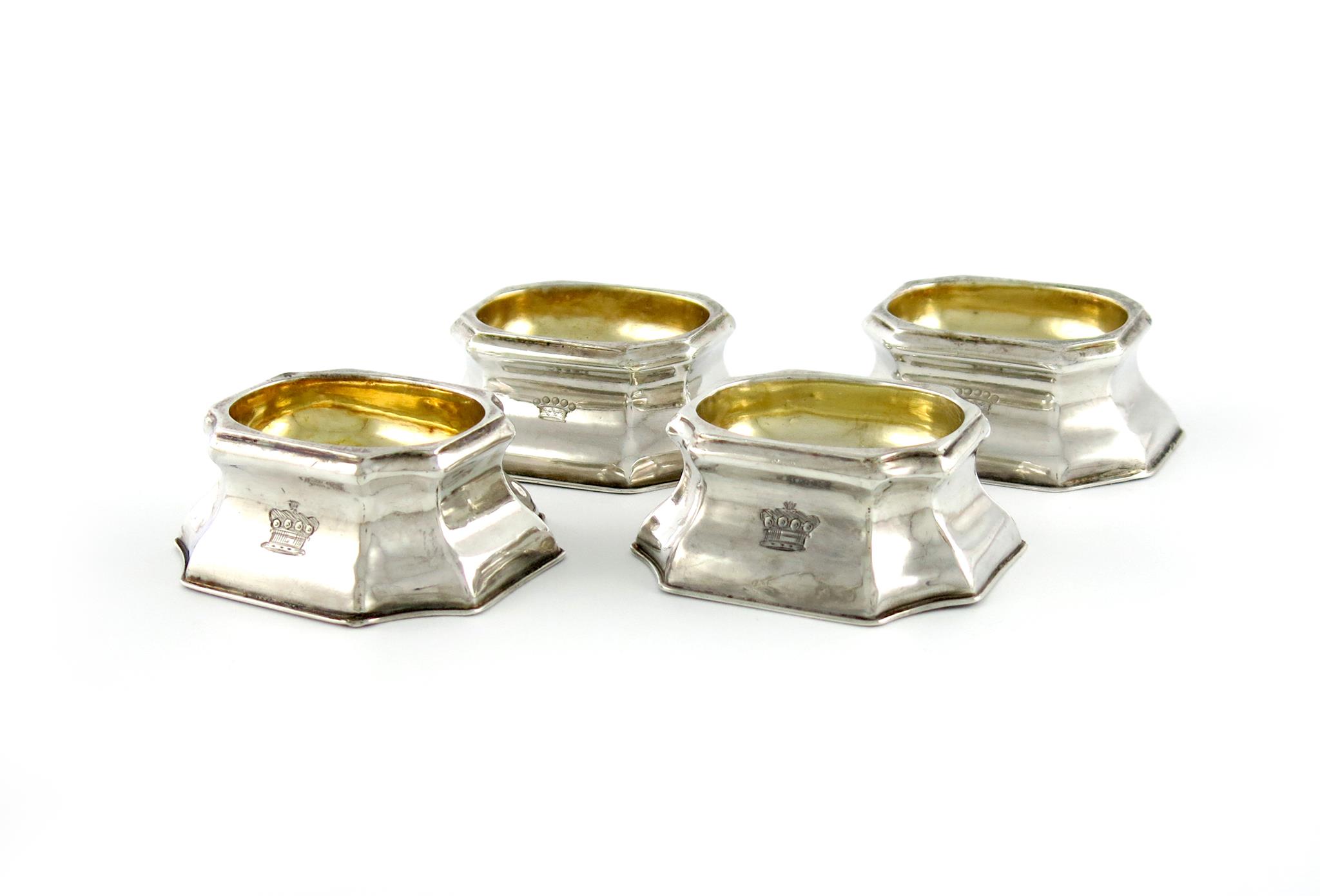 rectangular form, canted corners, gilded oval bowls, engraved with crests, length 7.4cm, approx. weight 6oz. (4)