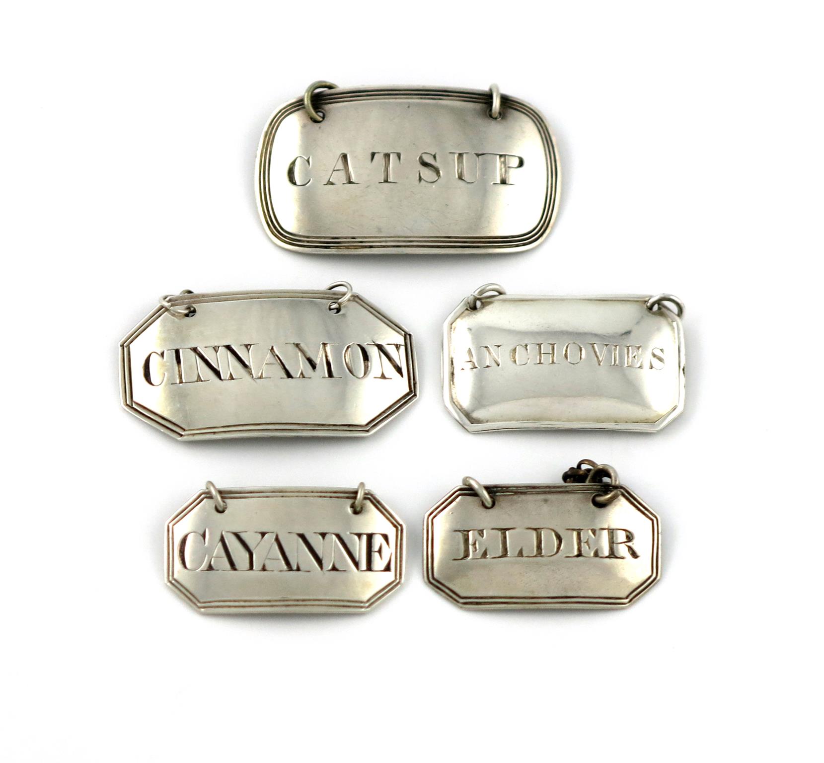 canted rectangular form, reeded borders, incised 'CATSUP', 'ANCHOVIES', 'CAYANNE', 'ELDER' and 'CINNAMON', approx. weight 0.9oz.