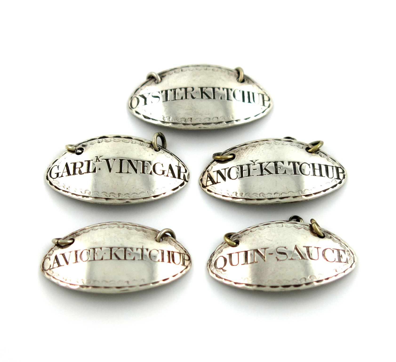 oval form, bright-cut borders, incised 'OYSTER KETCHUP', 'GARLK VINEGAR', 'CAVICE KECTHUP', 'ANCHY KETCHUP', 'QUIN SAUCE', approx. weight 0.4oz. (5)