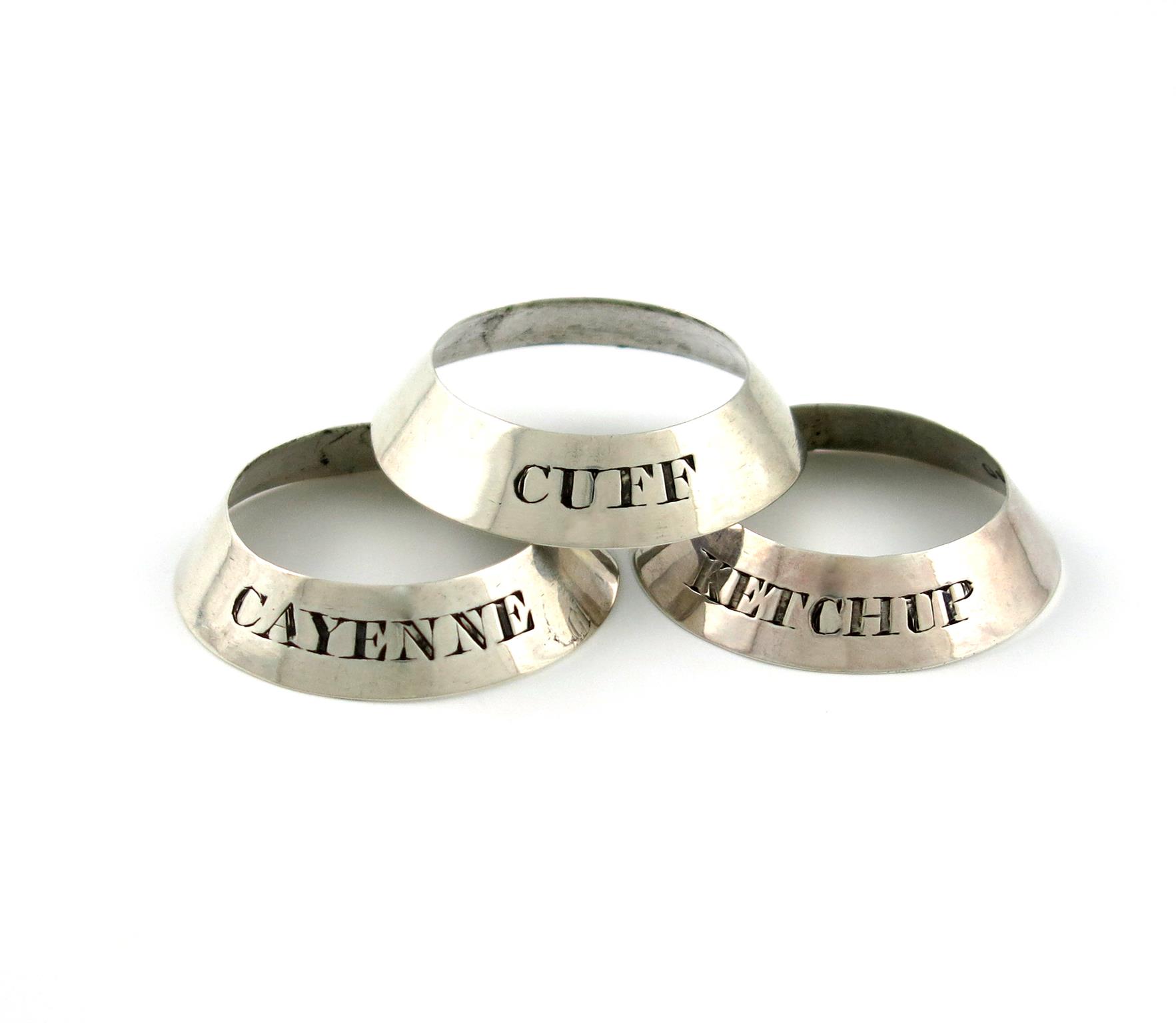 tapering circular form, incised 'CUFF', 'KETCHUP' and 'CAYENNE', approx. weight 0.4oz. (3)