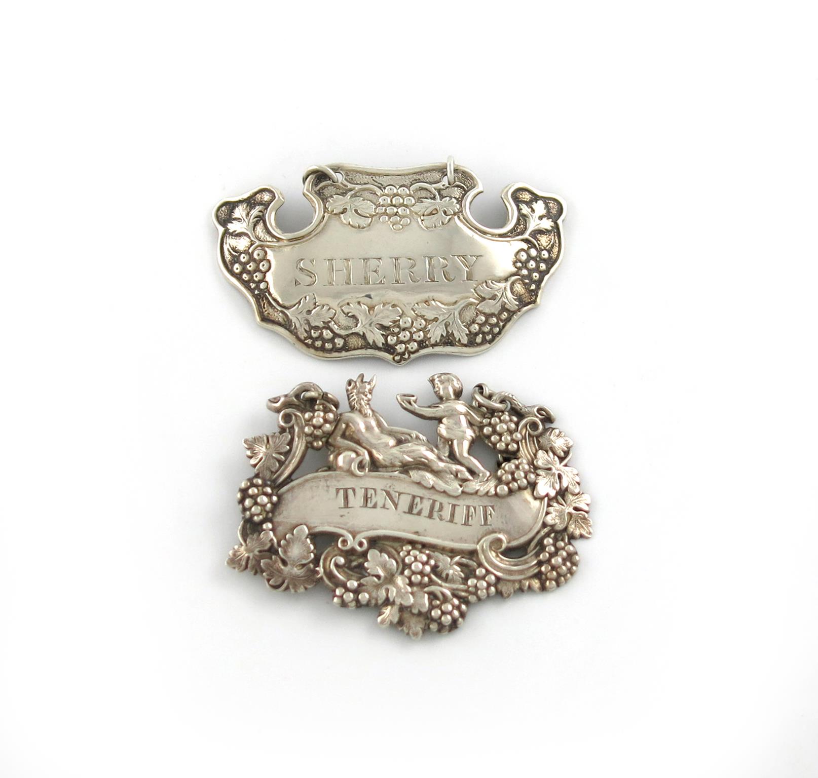 with Bacchus and a putto with scroll and trailing vine decoration, incised 'TENERIFF', length 6cm, plus a George IV silver wine label, by Robert Smith, Dublin circa 1835, of escutcheon form, vine decoration, incised 'SHERRY', approx. weight 0.9oz. (2)