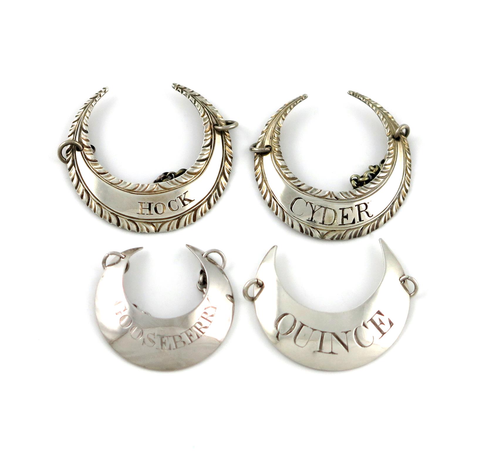 crescent form, some with feather-edge borders, comprising one by Joseph Willmore, Birmingham 1807, incised 'GOOSEBERRY', one by George Smith and Edward Hayter, London 1804, incised 'QUINCE', plus one incised 'CYDER' and one 'HOCK', approx. weight 1.1oz. (4)