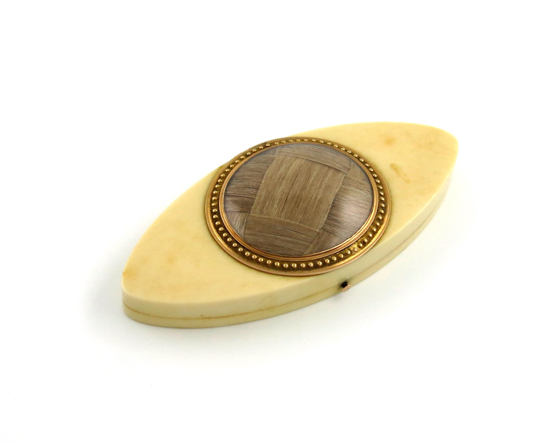 oval navette form, the hinged cover with plaited hair under glass, beaded gold border, with a press button which opens the cover to reveal an area for a portrait, the interior velvet lined and with a mirror, length 11.2cm.