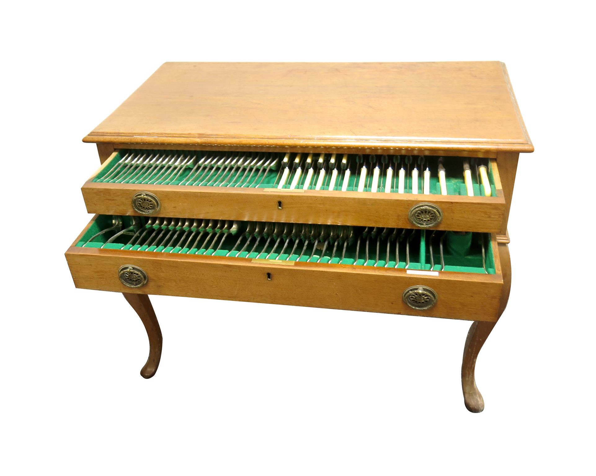 comprising: twelve table forks, twelve dessert forks, six tablespoons, twelve soup spoons, twelve dessert spoons, 10 teaspoons, plus two modern teaspoons, five egg spoons, a pair of sauce ladles, a pair of fish servers, a soup ladle, a basting spoon, a pair of pickle forks, a pair of butter knives, three salt spoons, two mustard spoons, a pair of sugar tongs, and two sugar spoons, (different dates), and a set of six lobster picks by H. Atkin, 1929, plus twelve ivory handled table knives and twelve dessert knives, plus a four-piece carving set, four electroplated knife rests, and a pair of electroplated nut crackers, in a two drawer wooden case on cabriole legs, approx. weight 138oz.