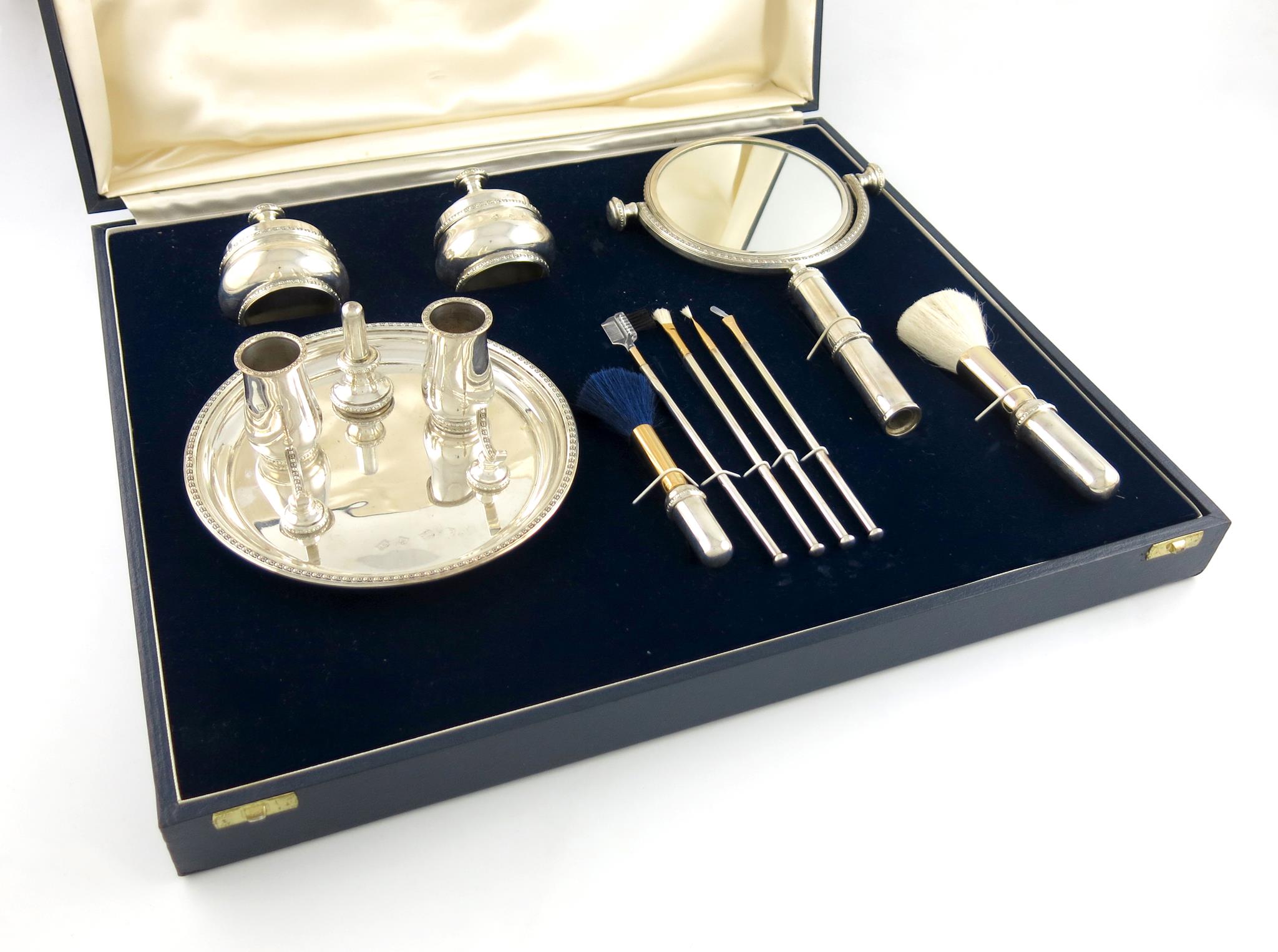 with a central circular dish, with two pots, four brushes and a brush stand, with a detachable hand mirror, six various brushes and two covered pots, beaded borders, on three bun feet, in a fitted case, approx. weight 22oz.
