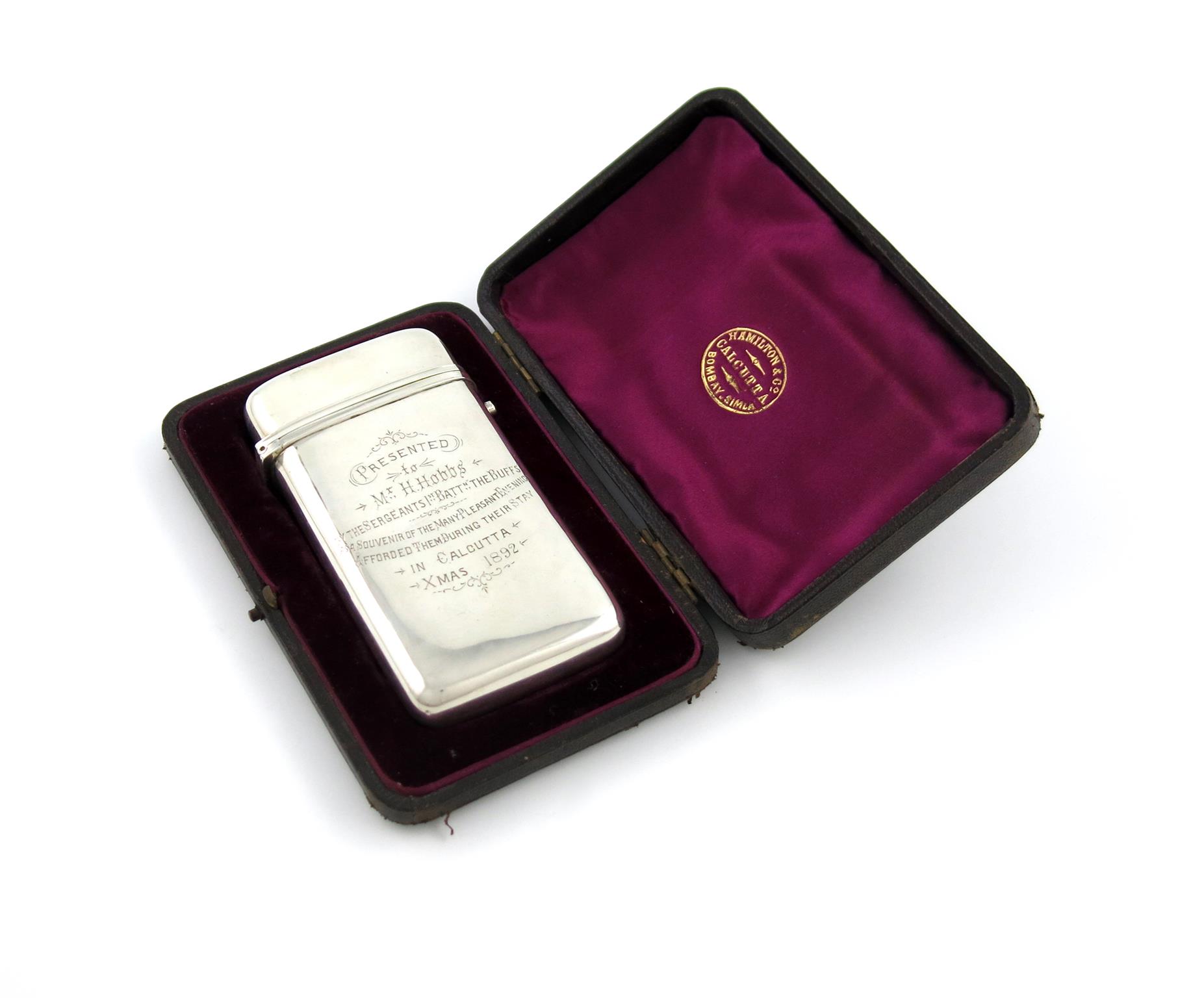 plain rectangular form, the front inscribed 'Presented to Mr. H. Hobbs, by the Sergeants 1st Battn. The Buffs, as a souvenir of the many pleasant evenings afforded them during their stay in Calcutta , Xmas 1892', in a fitted case, length 12cm, approx. weight 3oz.