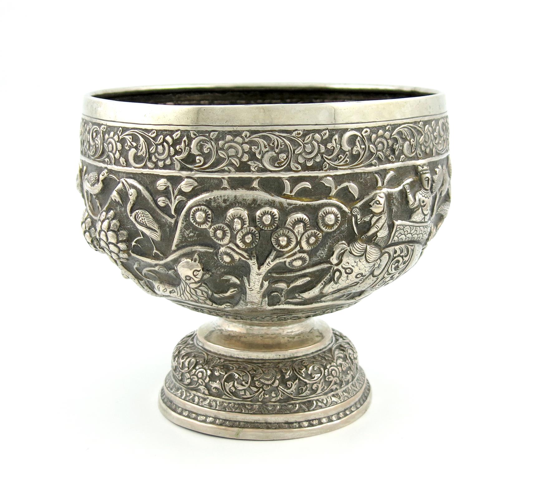 circular form, decorated with a hunting pattern, with foliate scroll borders, on a raised foliate scroll base, diameter 19cm, approx. weight 21.5oz.