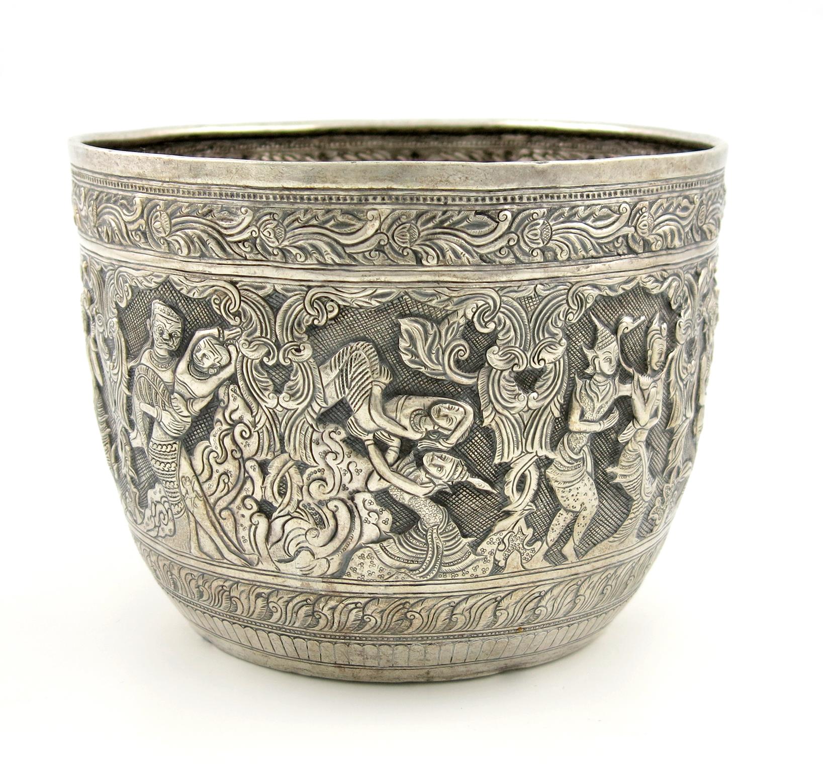 circular form, chased and embossed with figures and foliate scroll decoration, height 15.3cm, approx. weight 24oz.