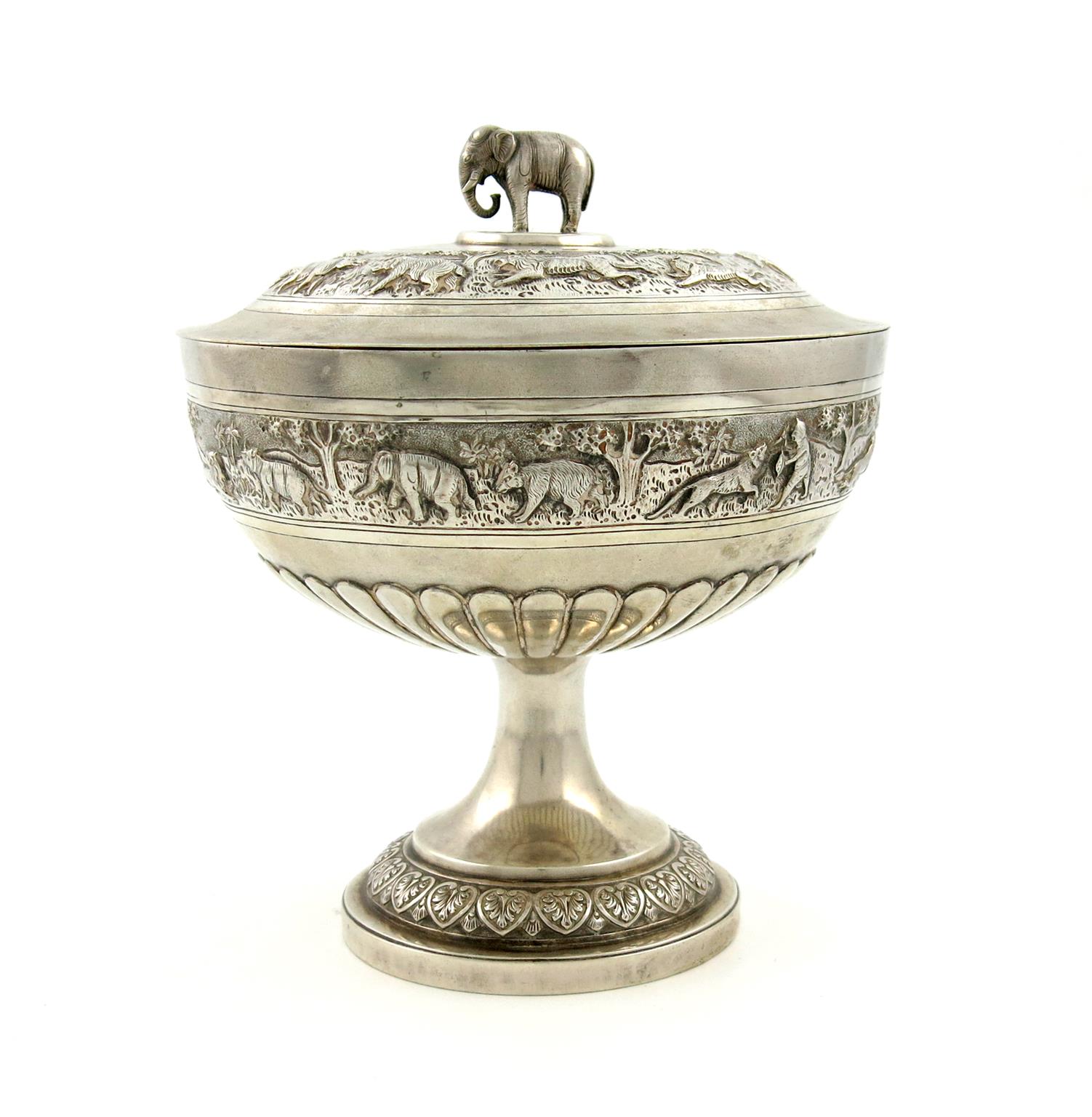circular form, chased with a hunting scene above part-fluted decoration, the pull-off cover with chased decoration and with an elephant finial, on a raised circular foot, height 19cm, approx. weight 26.5oz.