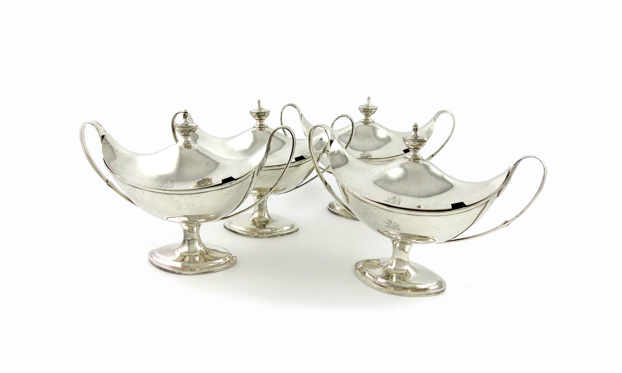 oval form, scroll handles, the pull-off covers with urn finials, on raised oval bases, engraved with a crest, length handle to handle 25cm, approx. weight 74.5oz. (4)