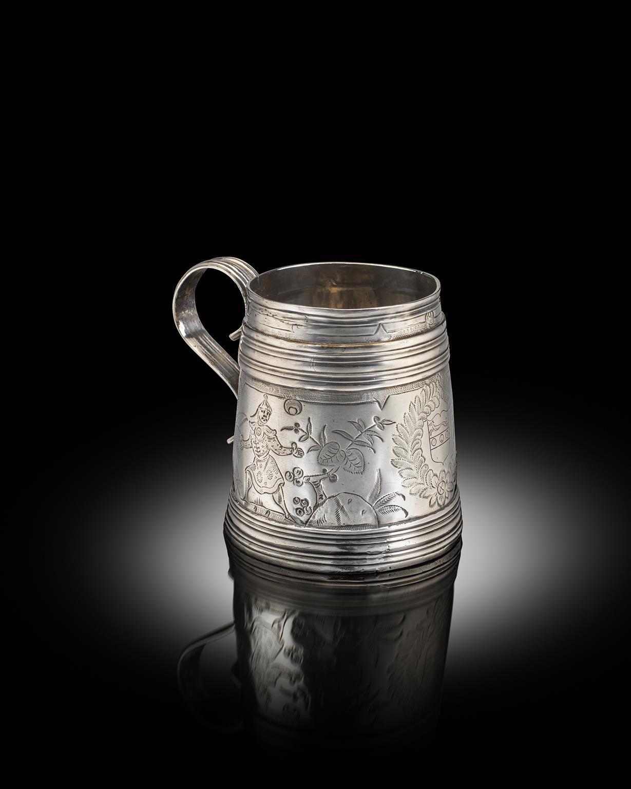 For an illustration and write up of this maker's mark and an illustration of a similar Chinoiserie tankard, see: Mitchell, D., Silversmiths in Elizabethan and Stuart London, The Boydell Press, 2017, pages 341-2