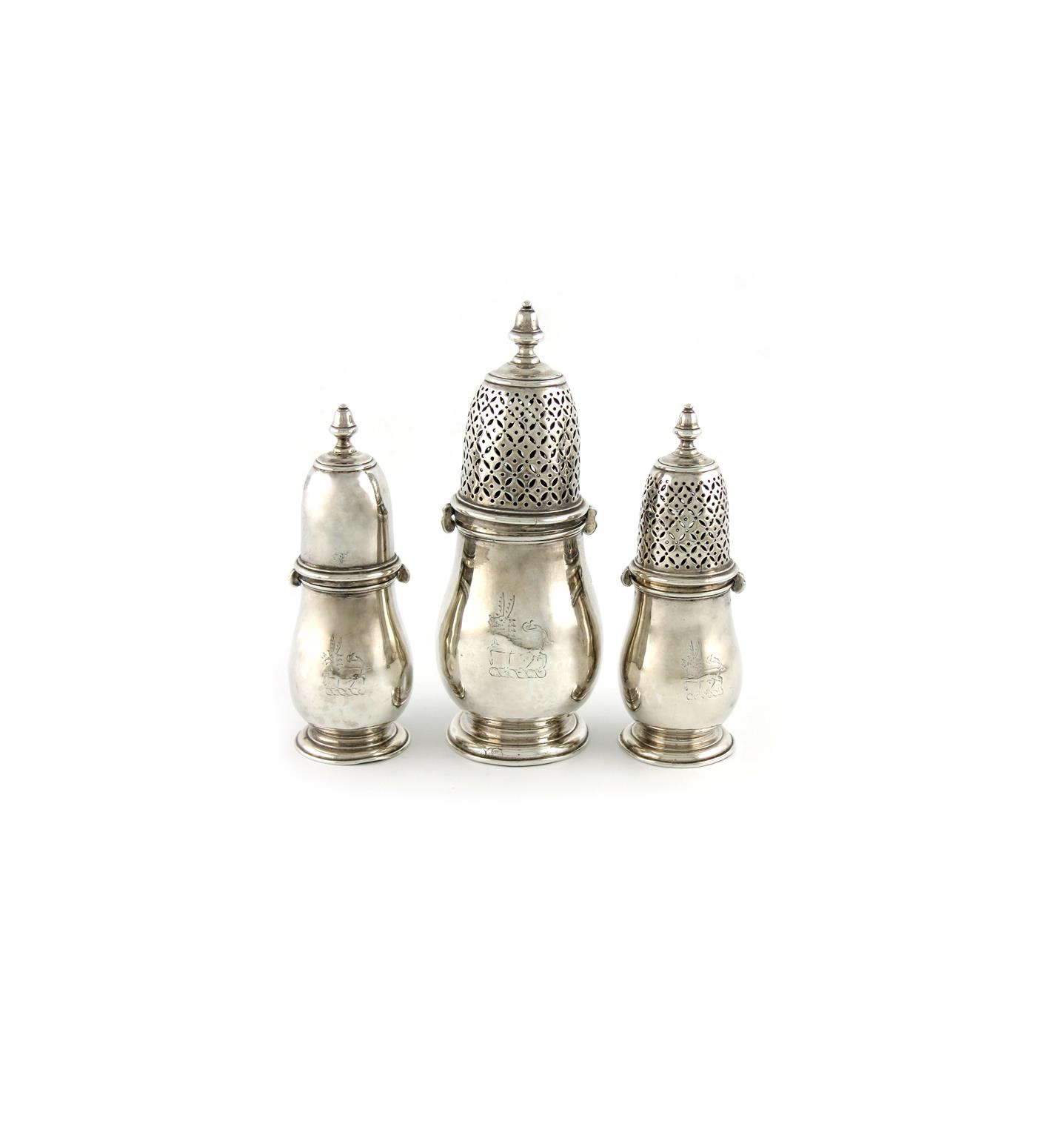 baluster form, bayonet fitting covers, acorn finials, engraved with a crest, one of the smaller casters with a blind cover, on raised circular bases, heights 18.8cm and 14.8cm, approx. weight 23.6oz. (3)