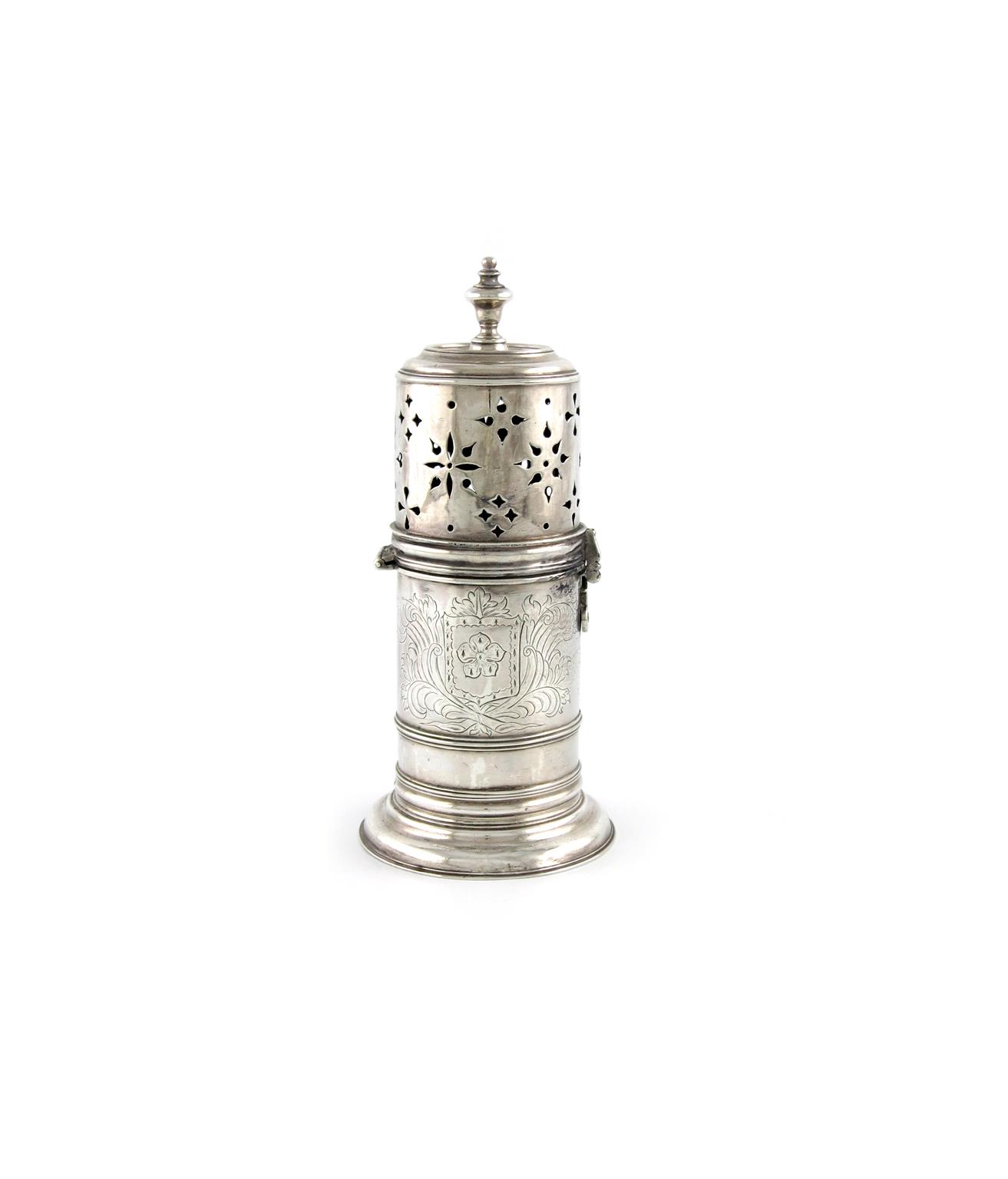 lighthouse form, the bayonet fitting cover with a later hinge and clasp, pierced decoration and with a knop finial, the body engraved with an armorial shield with feather mantling, on a raised circular foot, height 20cm, approx. weight 11oz.
