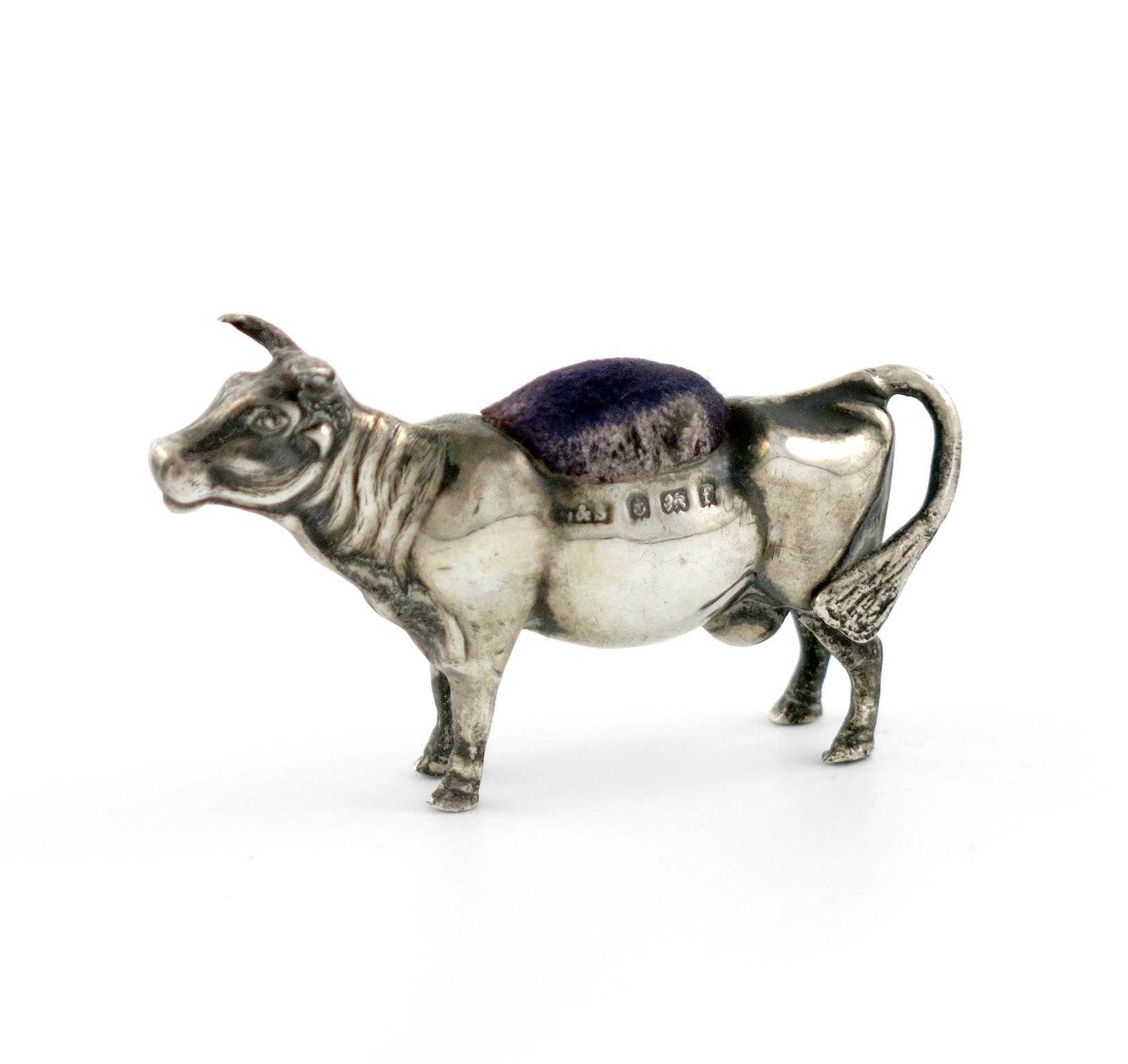 An Edwardian novelty silver bull pin cushion,