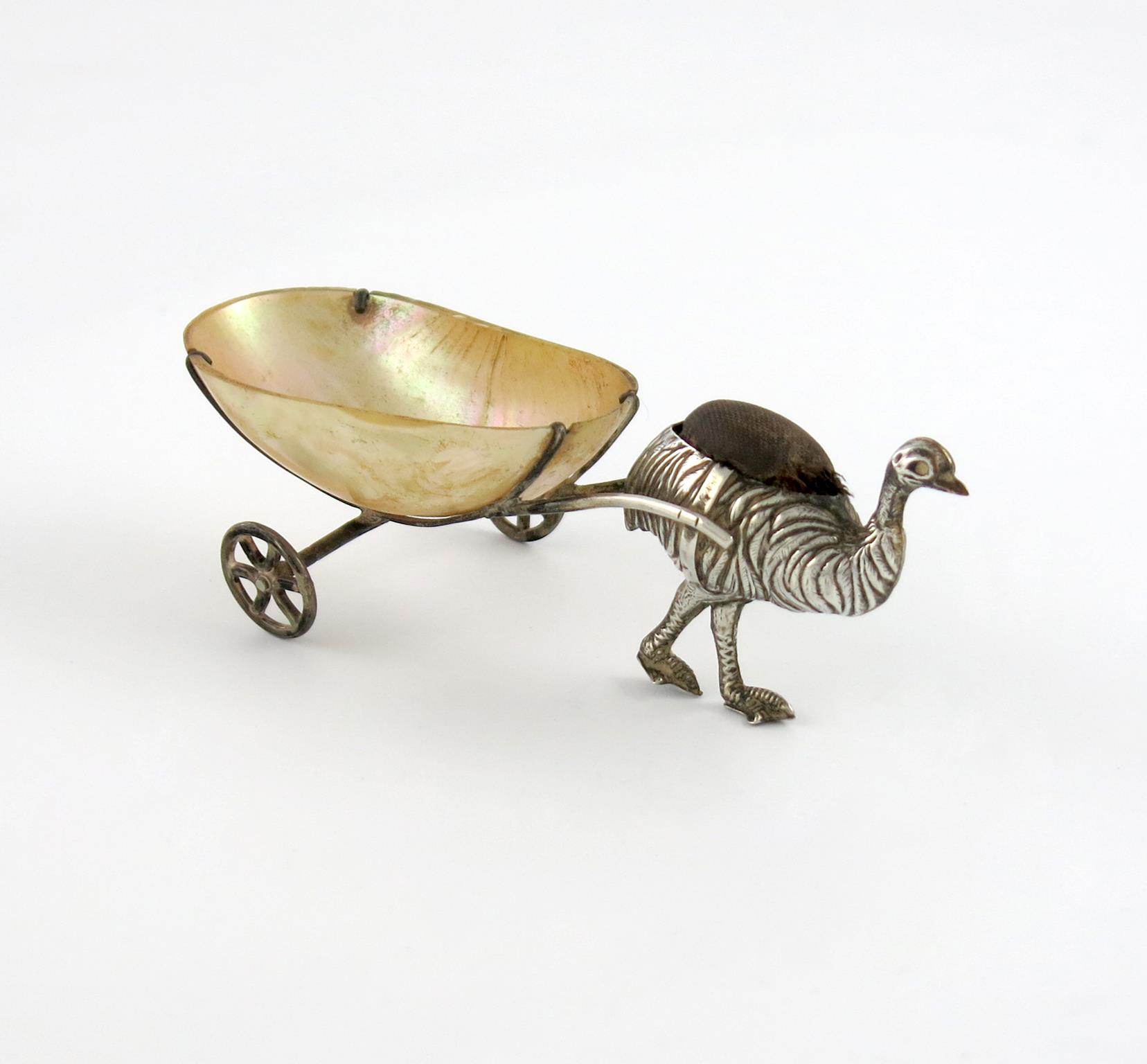 An Edwardian novelty silver emu and cart pin cushion