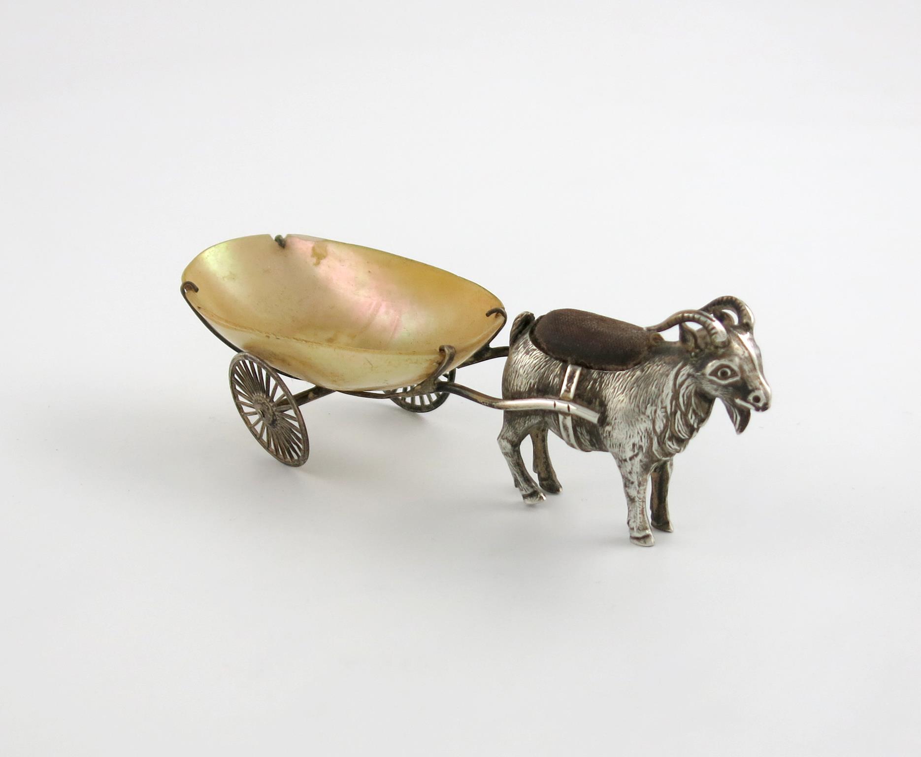 An Edwardian novelty silver billy goat and cart pin cushion,