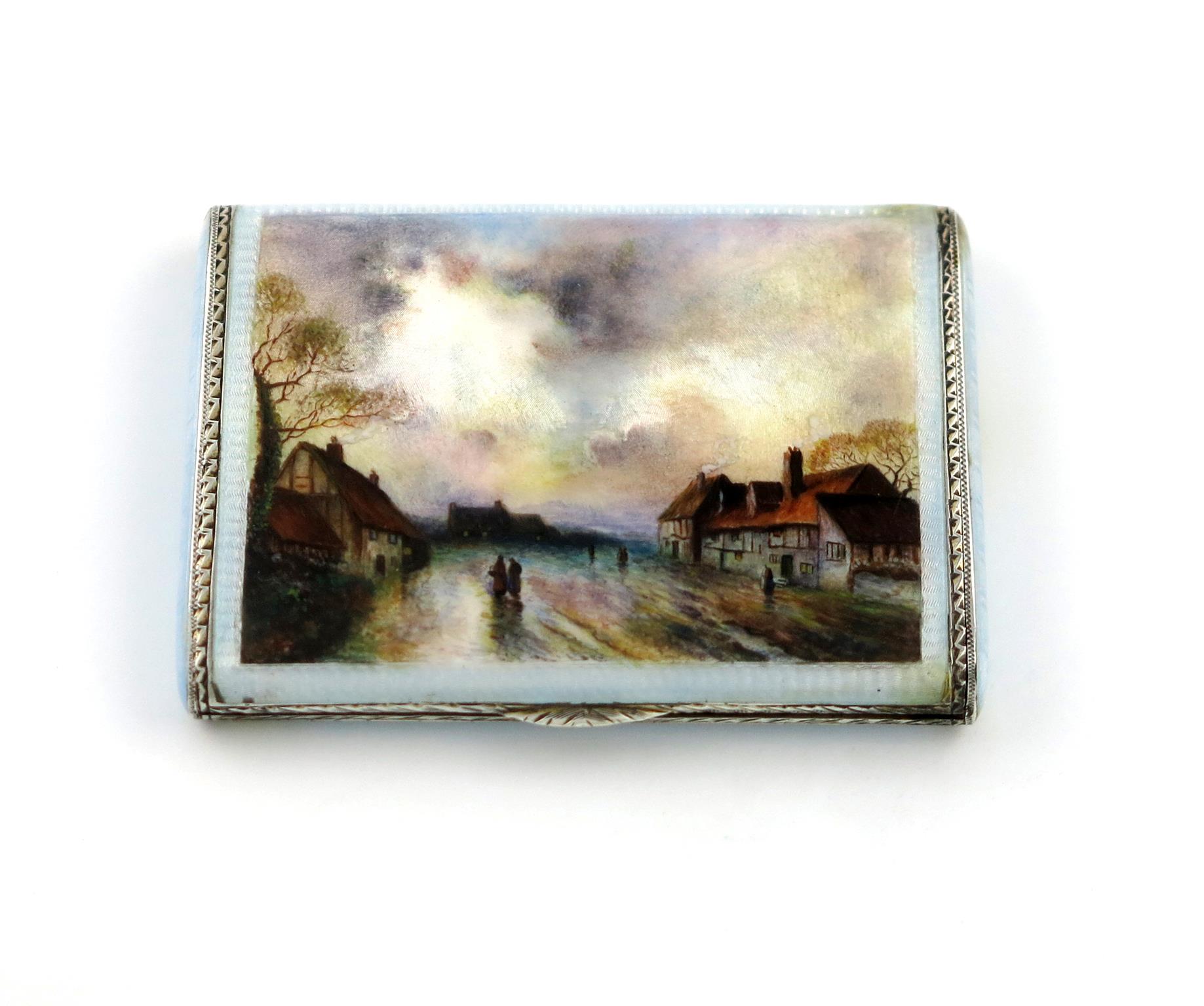 rectangular form, the hinged cover with a village scene, enamelled pearl coloured sides and base, gilded interior, length 8.3cm, approx. weight 4.4oz.