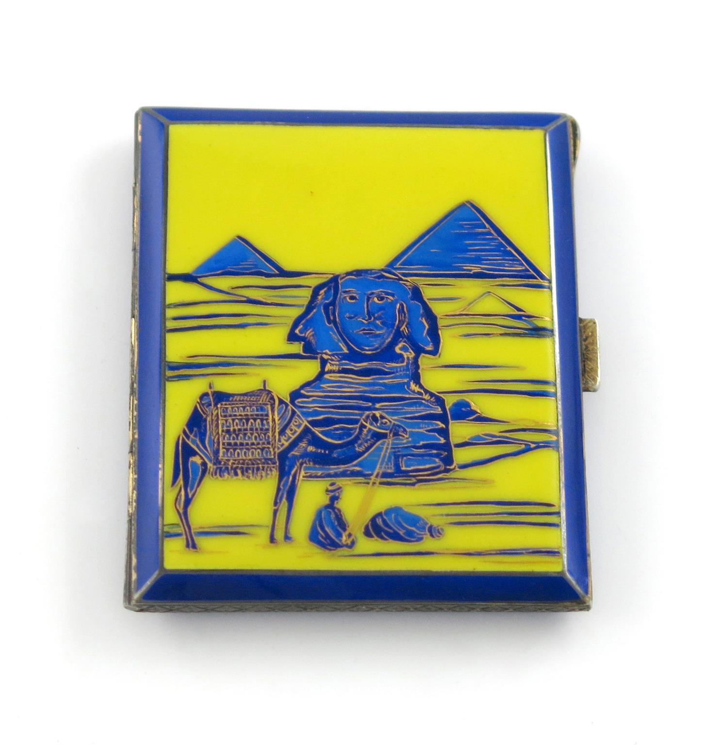 rectangular form, enamelled with the Pyramids, a sphinx, palm trees and a camel and seated man, in two coloured blue on a yellow background, length 7.8cm, approx. weight 5oz.