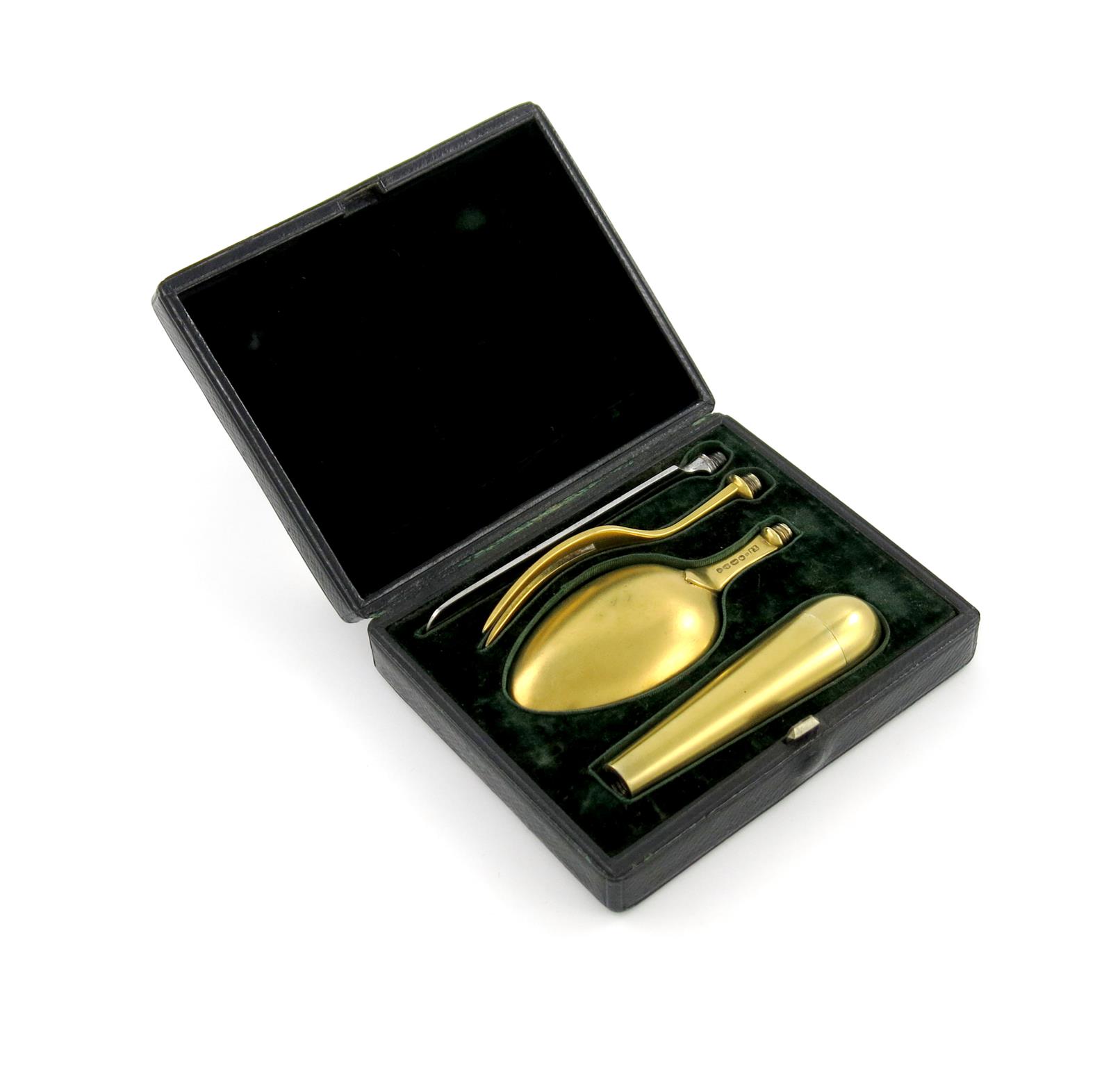the three screw-in handles of canon form, the smallest one opens to reveal a corkscrew, in a fitted case, length of fork 15.8cm, approx. weighable 4oz.