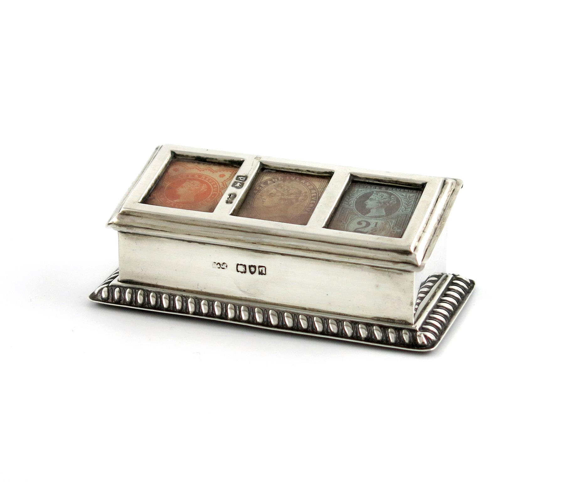 rectangular form, the sprung hinged cover with three stamps under glass, the gilded interior with three compartments, on a rectangular gadrooned base, length 9.3cm.