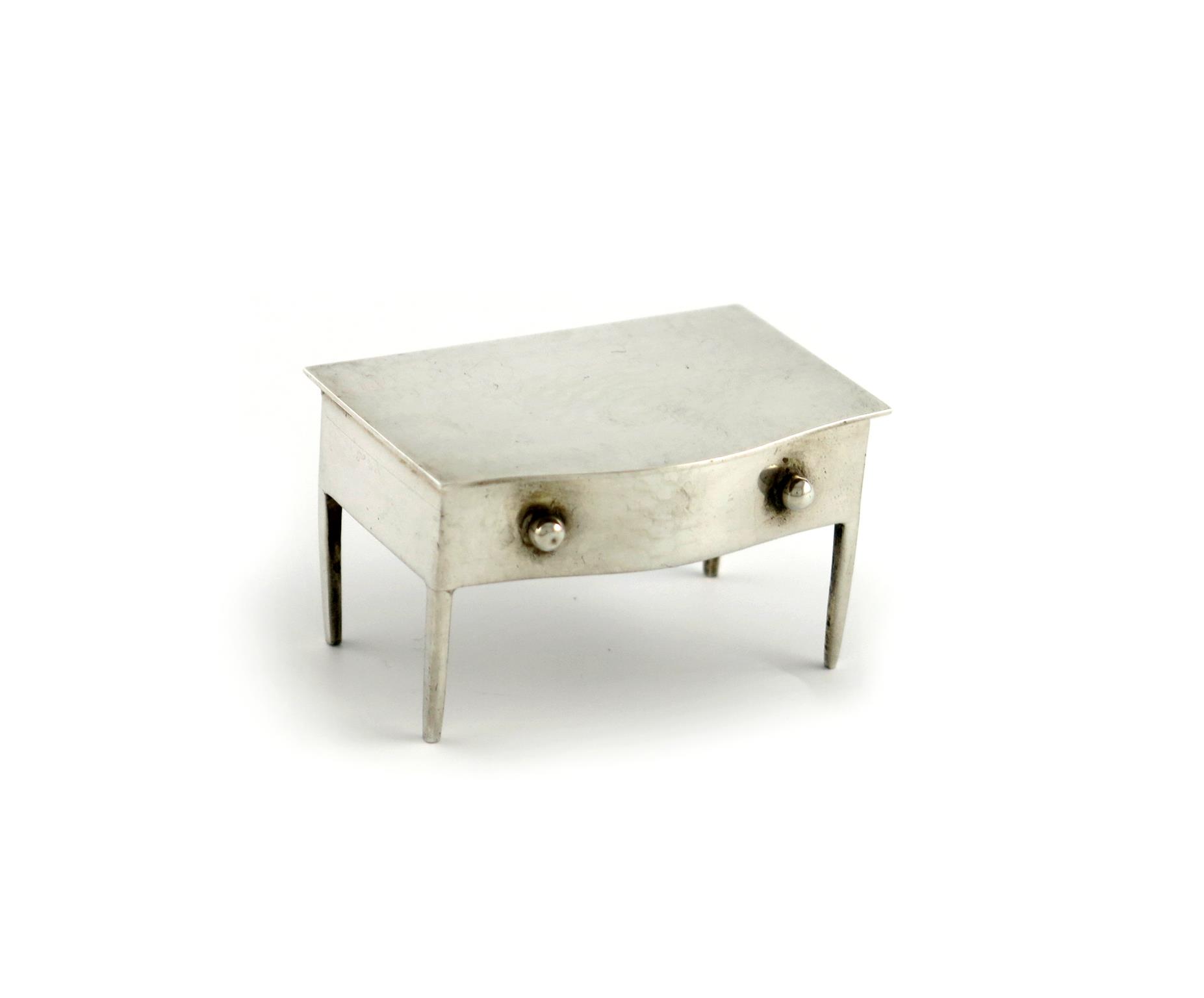 modelled as a lowboy, the hinged cover opens to reveal two compartments, the serpentine front with a dummy drawer, length 5.8cm, approx. weight 1.6oz.