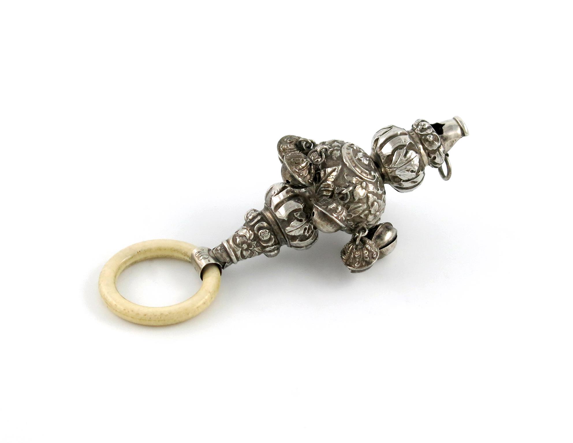 baluster form, embossed foliate scroll decoration, with seven bells and a ring attachment, with a later plastic teething ring, length 14.3cm.