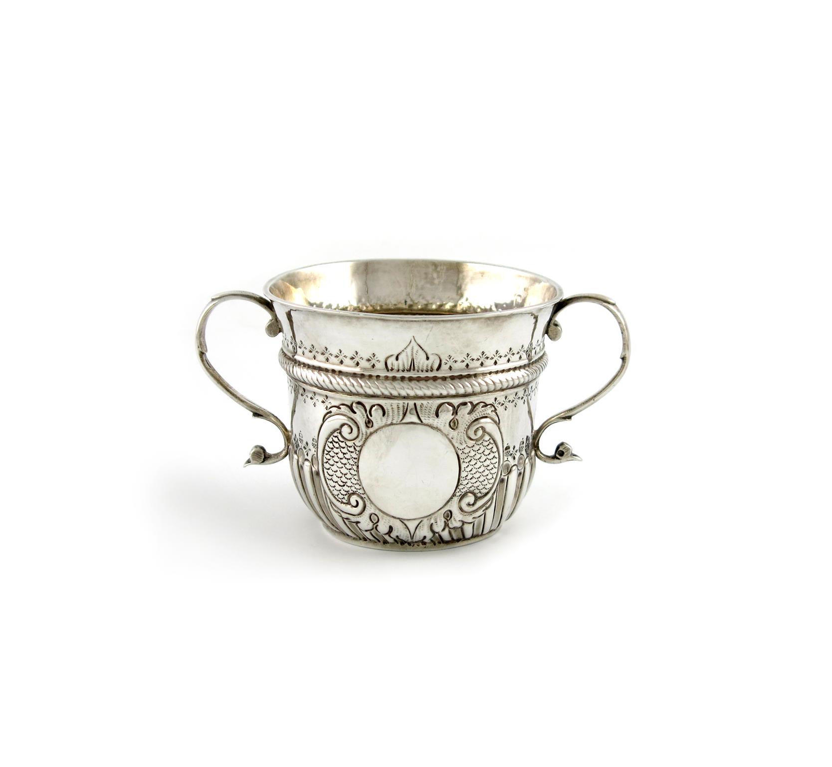 circular form, part-fluted decoration below a rope-work border, scroll handles, central oval cartouche with scroll mantling, height 8.6cm, approx. weight 6oz.