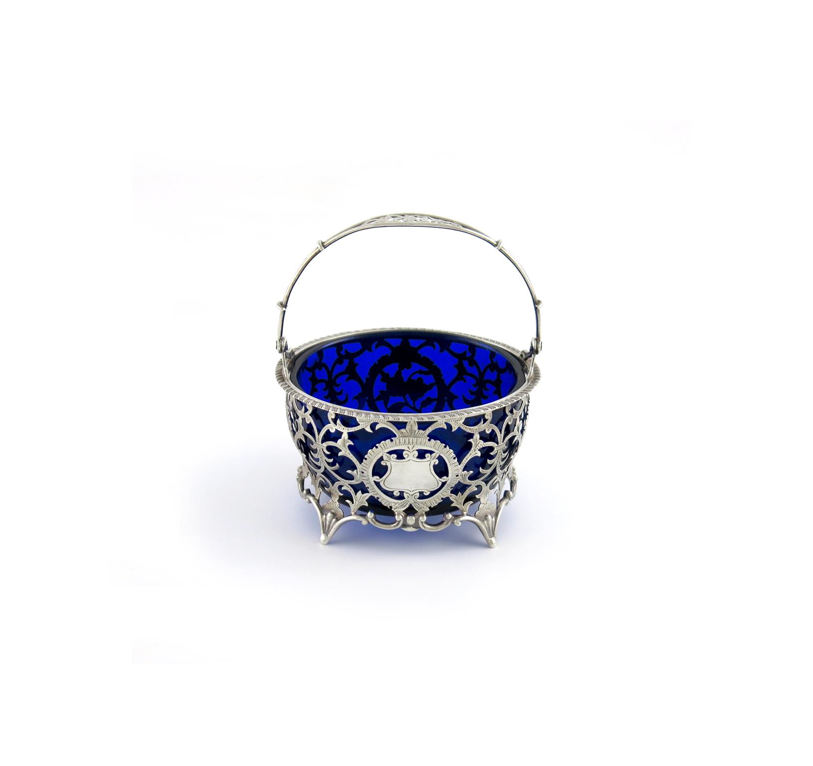 circular form, pierced and engraved foliate scroll decoration, pierced scroll handle, on four pierced bracket feet, diameter 10.7cm, approx. weight 3.7oz.