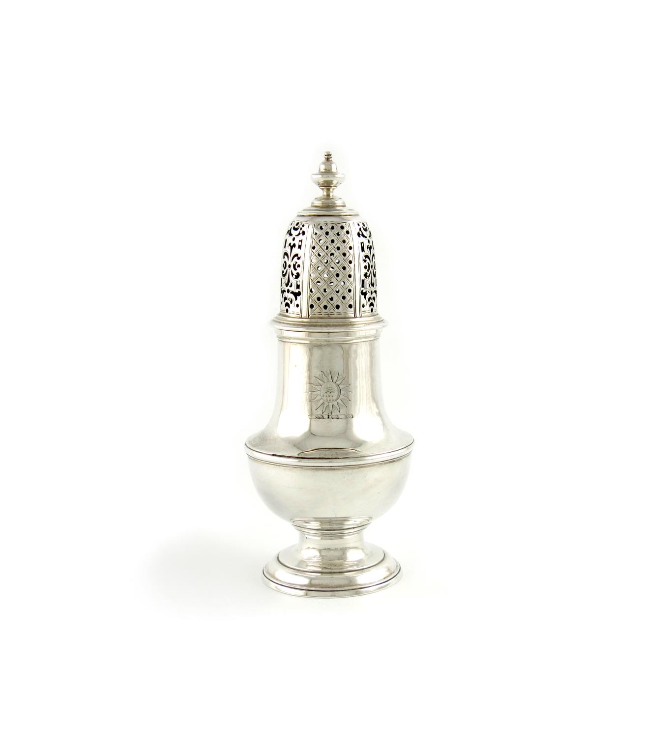 circular bellied form, the pull-off cover with pierced decoration and with a knop finial, engraved with a crest, on a raised circular foot, height 18.5cm, approx. weight 7.9oz.