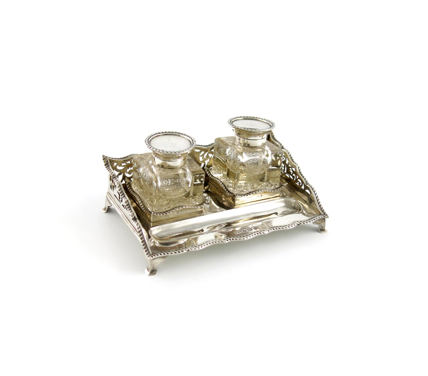 rectangular form, pierced foliate scroll gallery, gadroon borders, on four bracket feet with a pen well and two silver-mounted glass inkwells, length 18cm, approx. weight 10.7oz.
