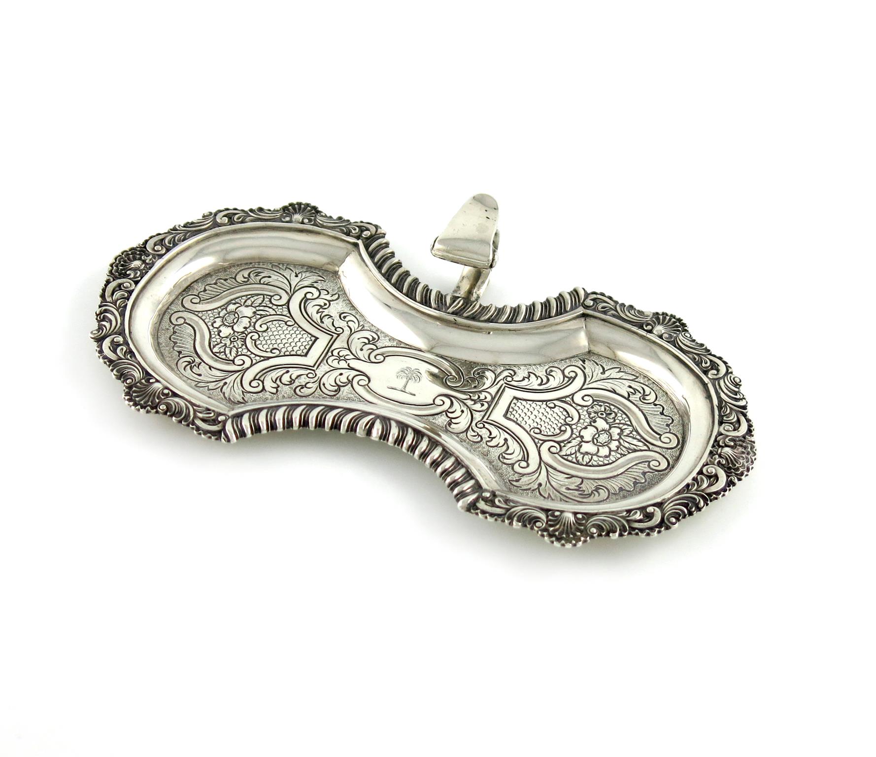 shaped oblong form, gadroon and shell border, the centre with chased foliate scroll decoration and with a crest, scroll handle, length 23cm, approx. weight 9oz.