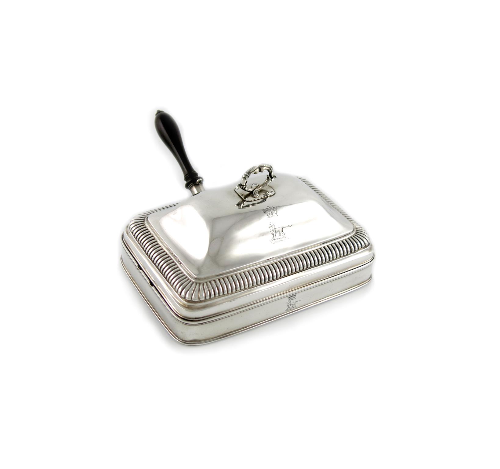 rounded rectangular form, domed hinged cover with a fluted border, foliate handle and engraved with a crowned crest, screw-out detachable turned wooden handle, length 24.2cm, approx. weight 40oz.