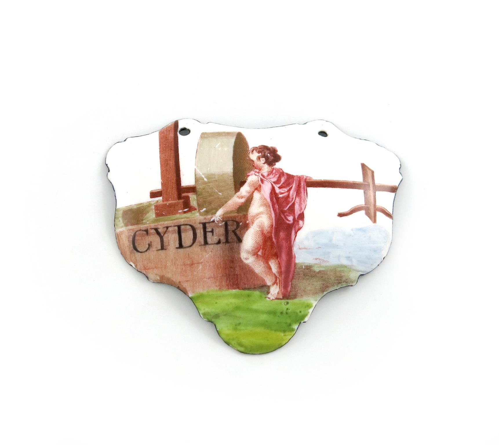 escutcheon form, with cupid and a cider press, titled 'CYDER', length 7.2cm.